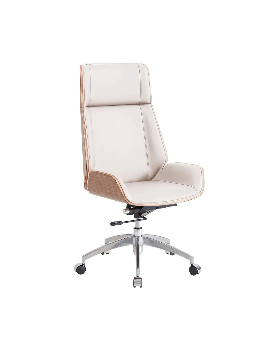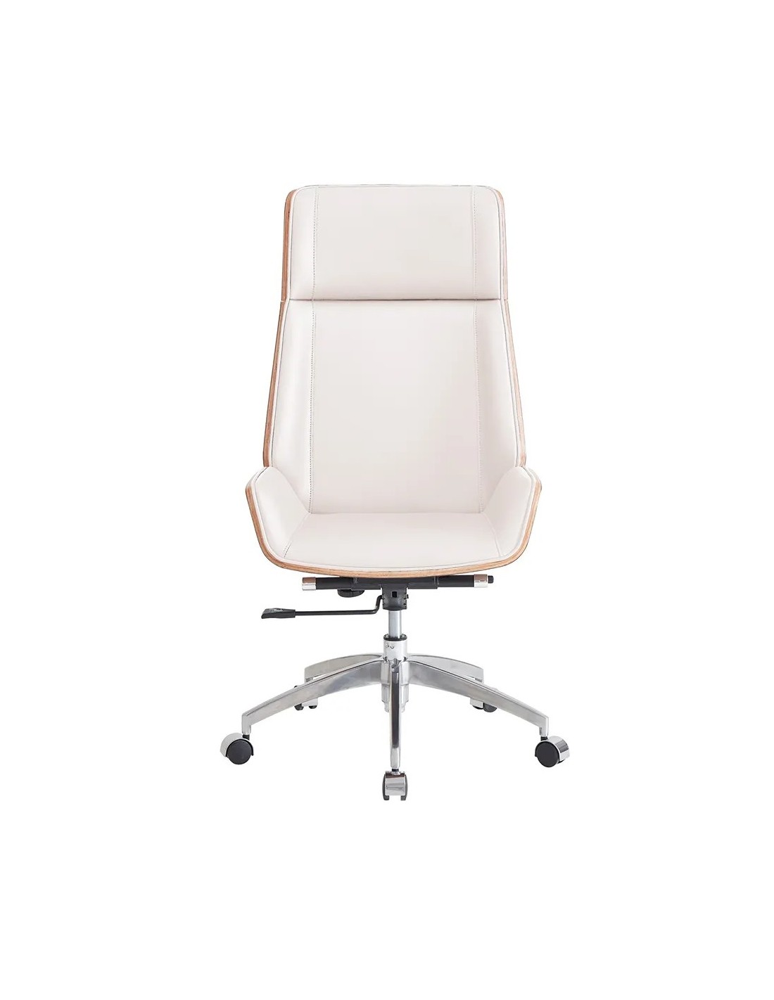 Altura regulable.Basculante con bloqueo.Traseras de asiento y respaldo en madera laminada.Tejido símil piel color blanco crema.