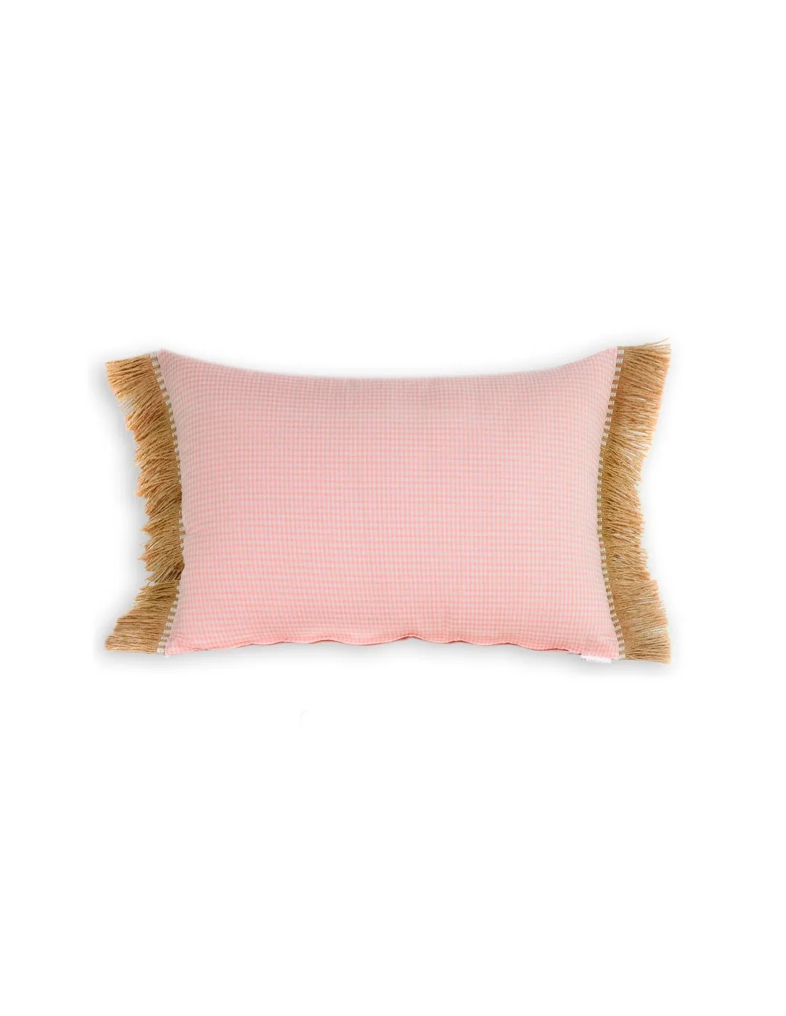 Cojín rectangular cama sofá vichy rosa blanco relleno pluma fleco rafia 60x40