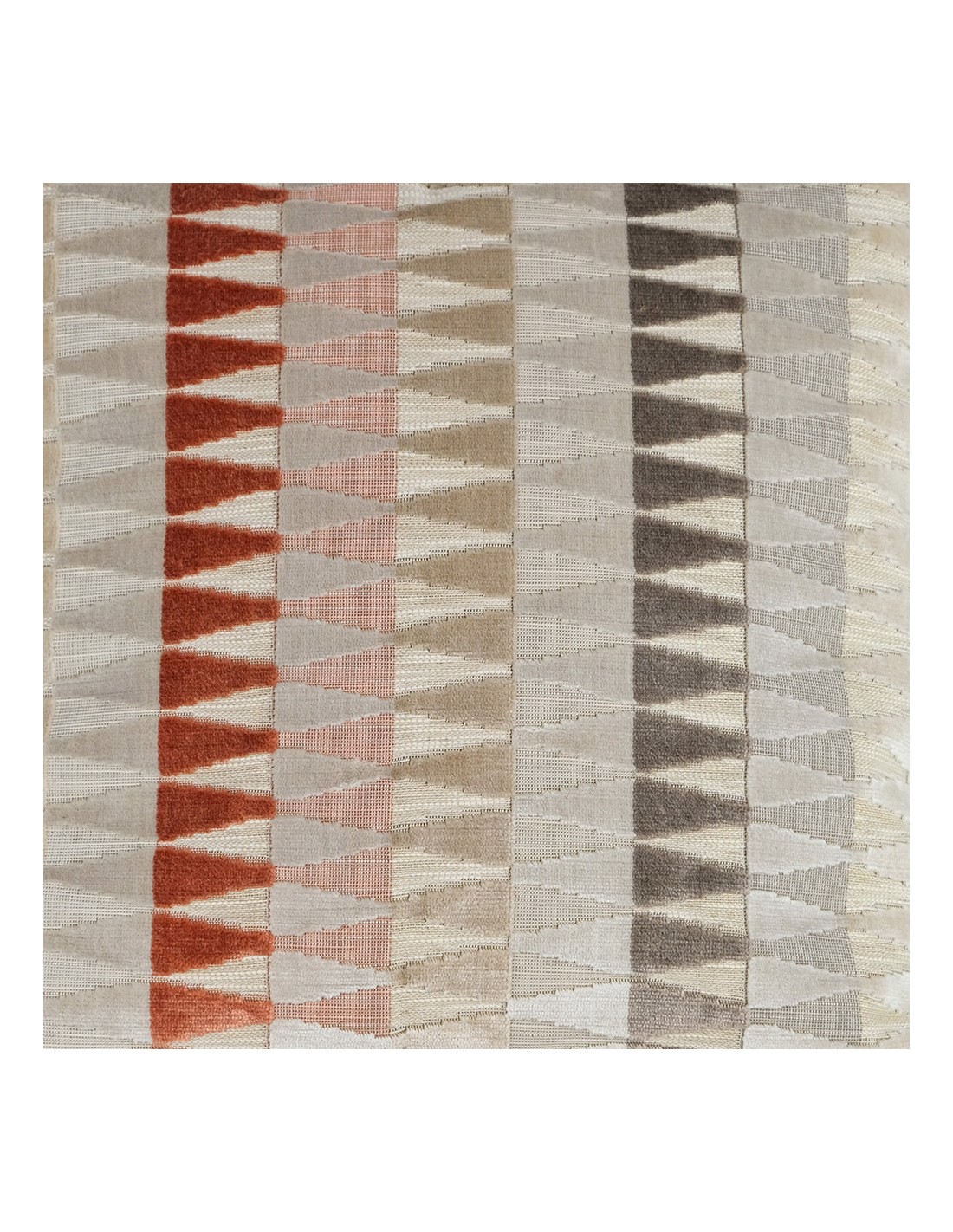 Cojín decorativo para cama o sofá 50x50 cm, Relleno Premium efecto Pluma incluido, tejido aterciopelado diseño geométrico triángulos con franjas en tonos beige, marrones, grises y un toque de color en naranja cálido, Fleco aena. Descubre el confort supremo con nuestros cojines Tapidecor, diseñados para crear un ambiente único y exclusivo en tu dormitorio o salón.