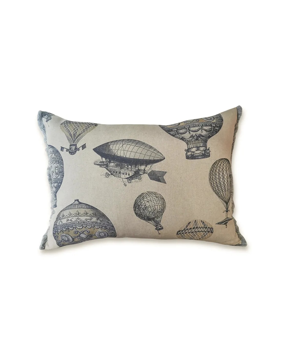 Cojín rectangular cama sofá estampado globos azul y gris relleno pluma, fleco gris 70x50