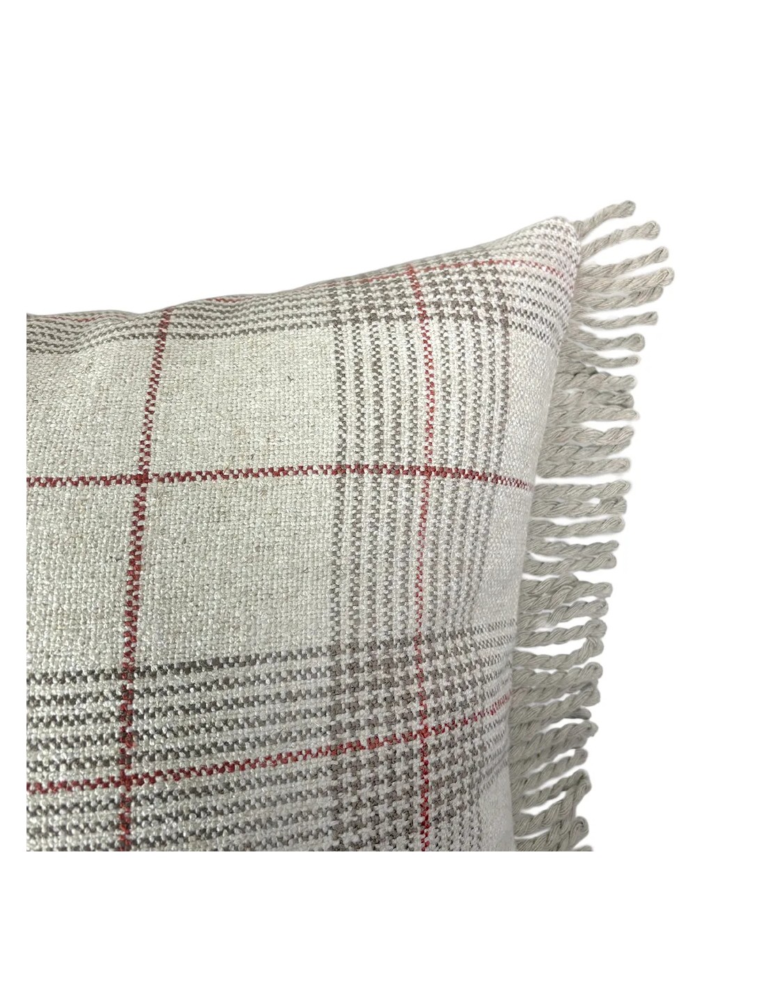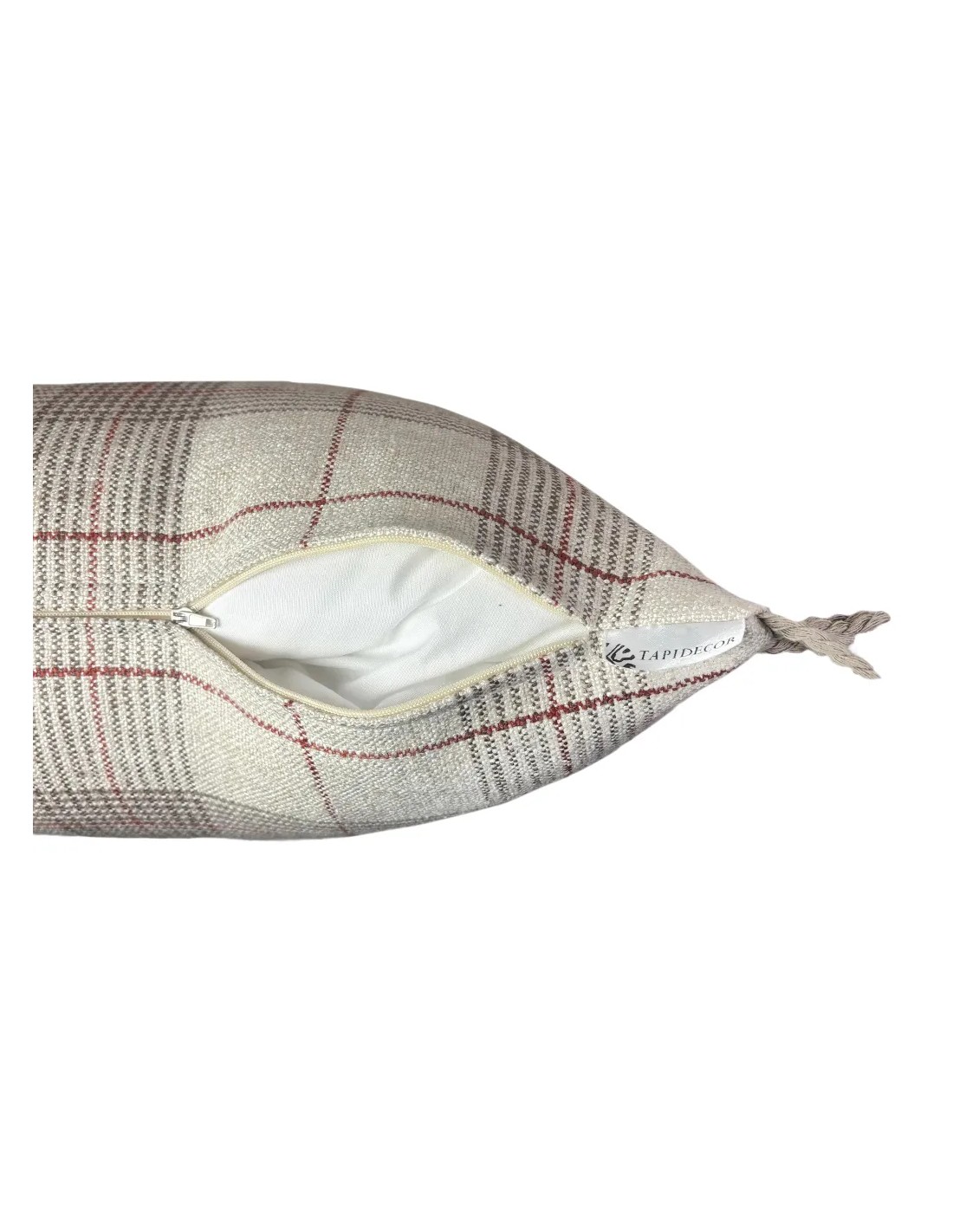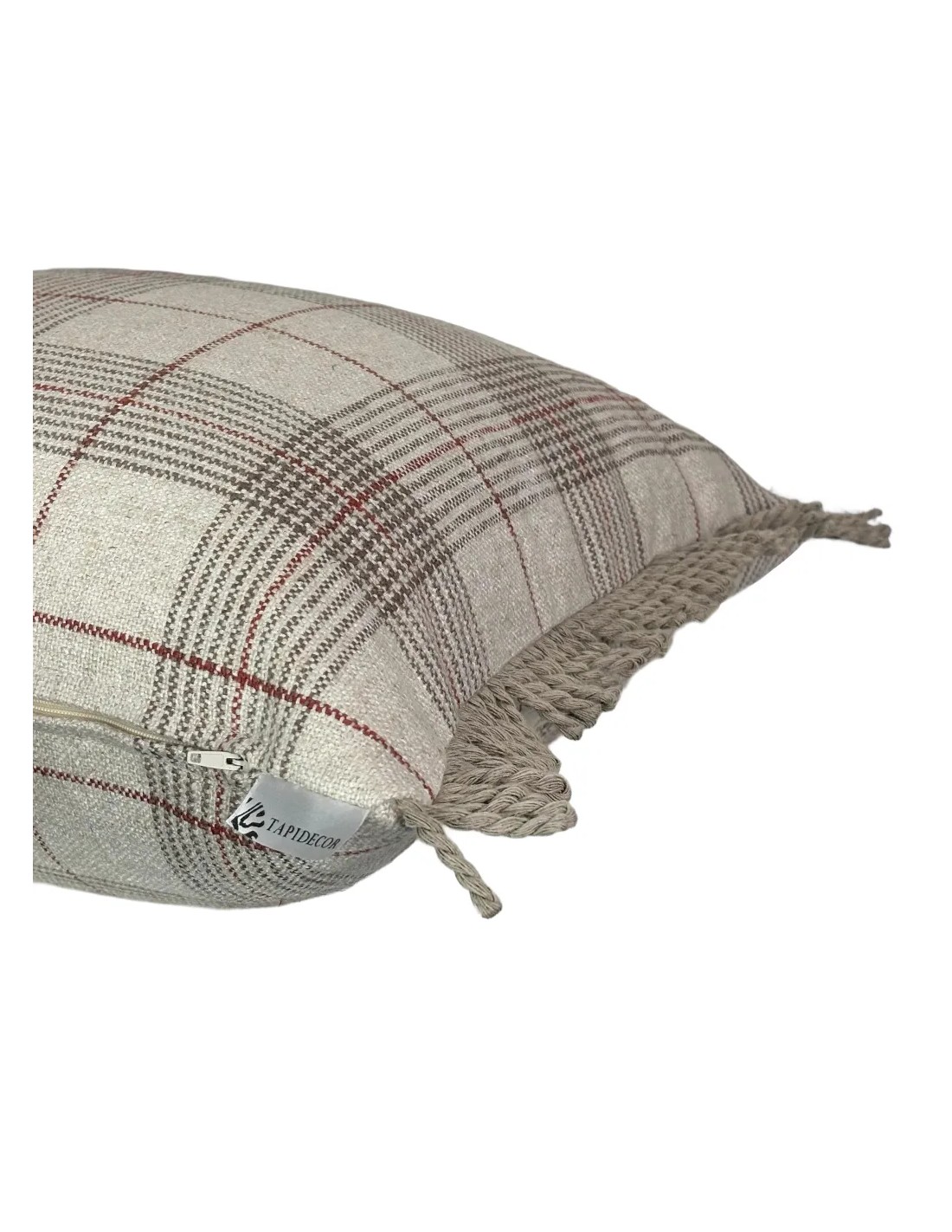 Cojín cuadros fondo beige fleco rizado caqui 50X50 Relleno Premium incluido