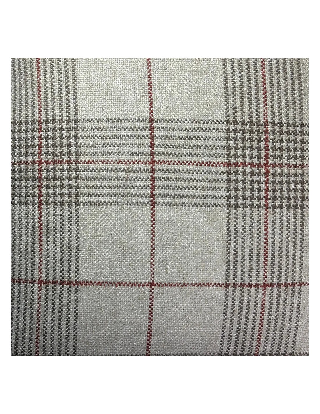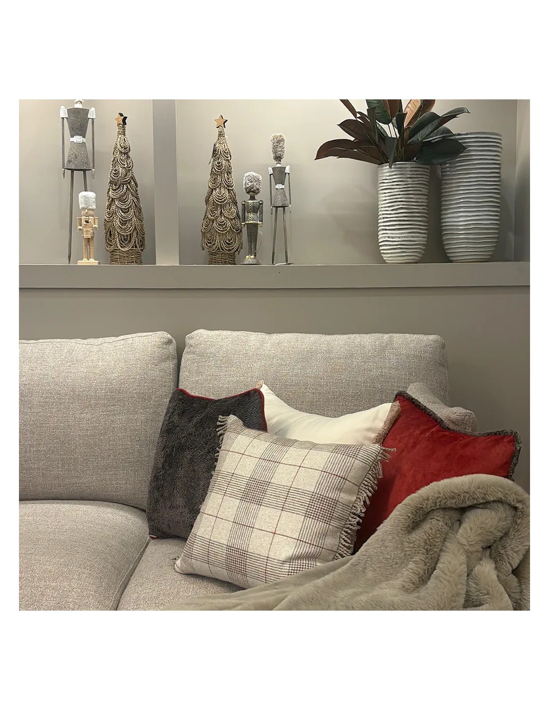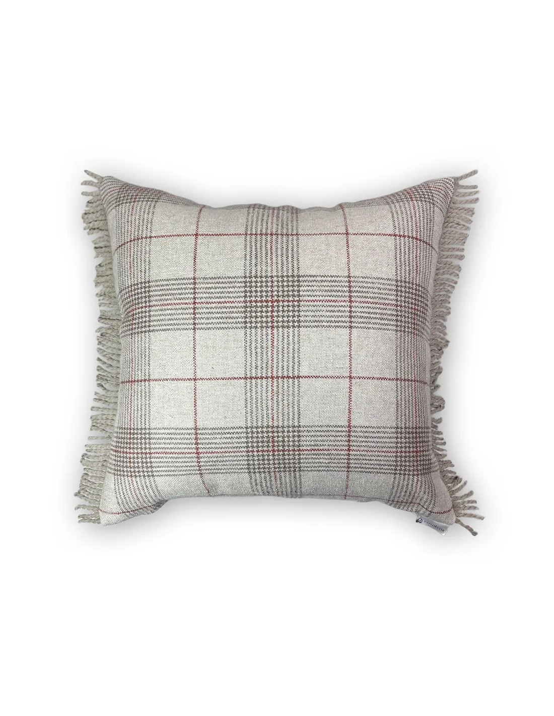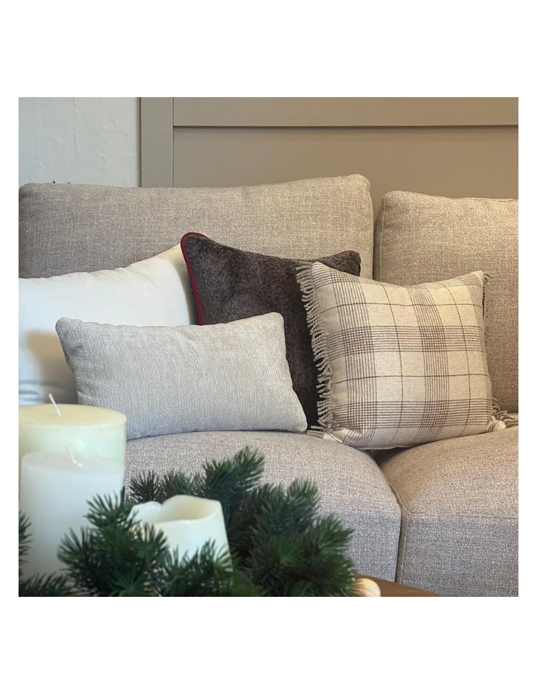 Cojín cuadros fondo beige fleco rizado caqui 50X50 Relleno Premium incluido