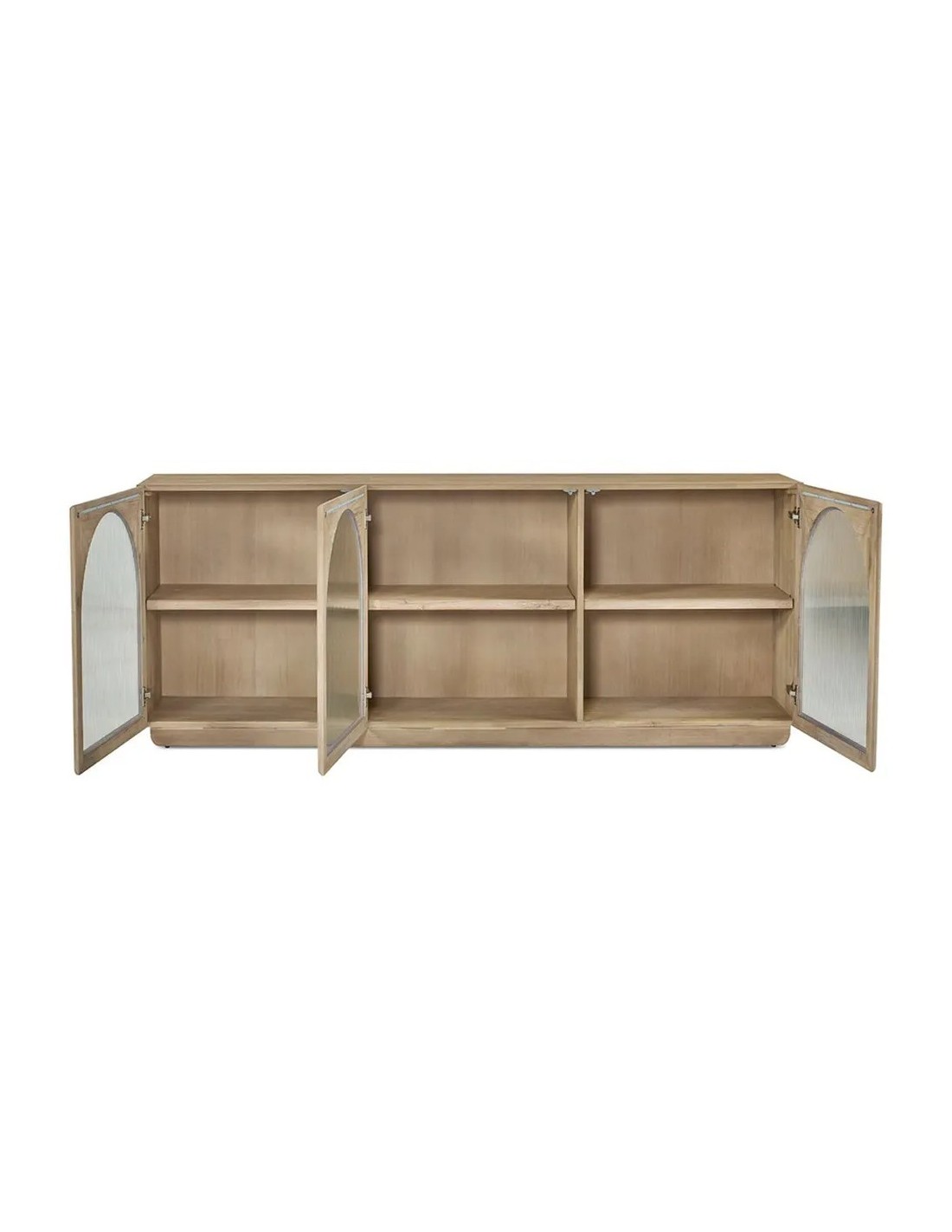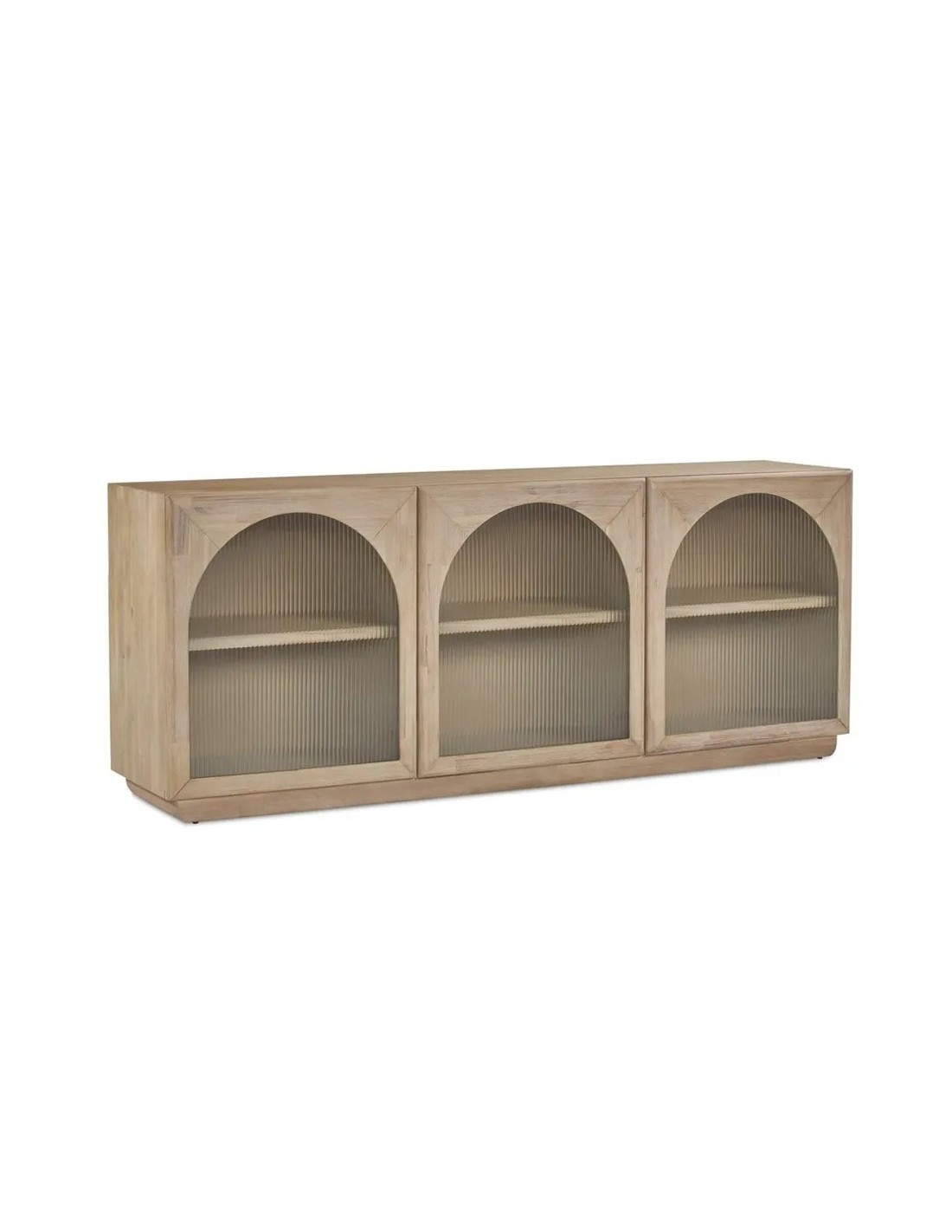 Aparador de diseño elegante fabricado en madera natural, con 3 puertas de cristal acanalado que aportan ligereza visual y un toque sofisticado.