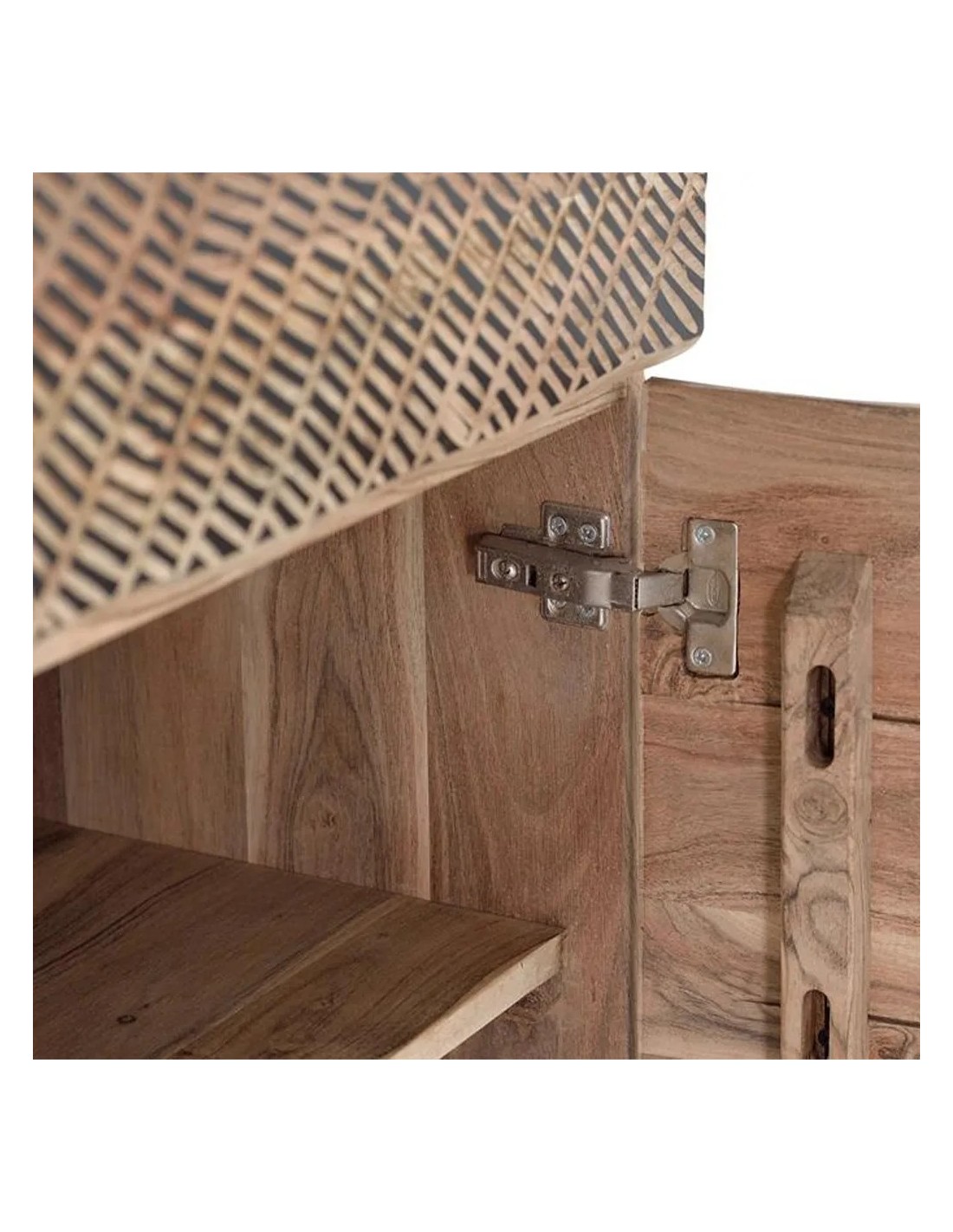 Aparador fabricado en madera maciza de acacia con acabado natural, que destaca por sus frontales tallados a mano, aportando un toque artístico y único a cada pieza. Dispone de 4 puertas batientes con amplios estantes interiores, perfectos para mantener el orden. Las bisagras con sistema de frenado garantizan un cierre suave y silencioso. Las patas metálicas en contraste aportan estabilidad y un aire moderno. Con sus dimensiones de 200x40x90 cm, este aparador se convierte en un elemento funcional y estético ideal para salones o comedores con personalidad.