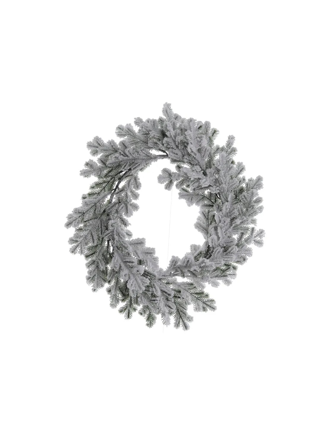 Corona decorativa de pino con efecto nieve, ideal para aportar un ambiente invernal elegante y acogedor durante la temporada navideña.
