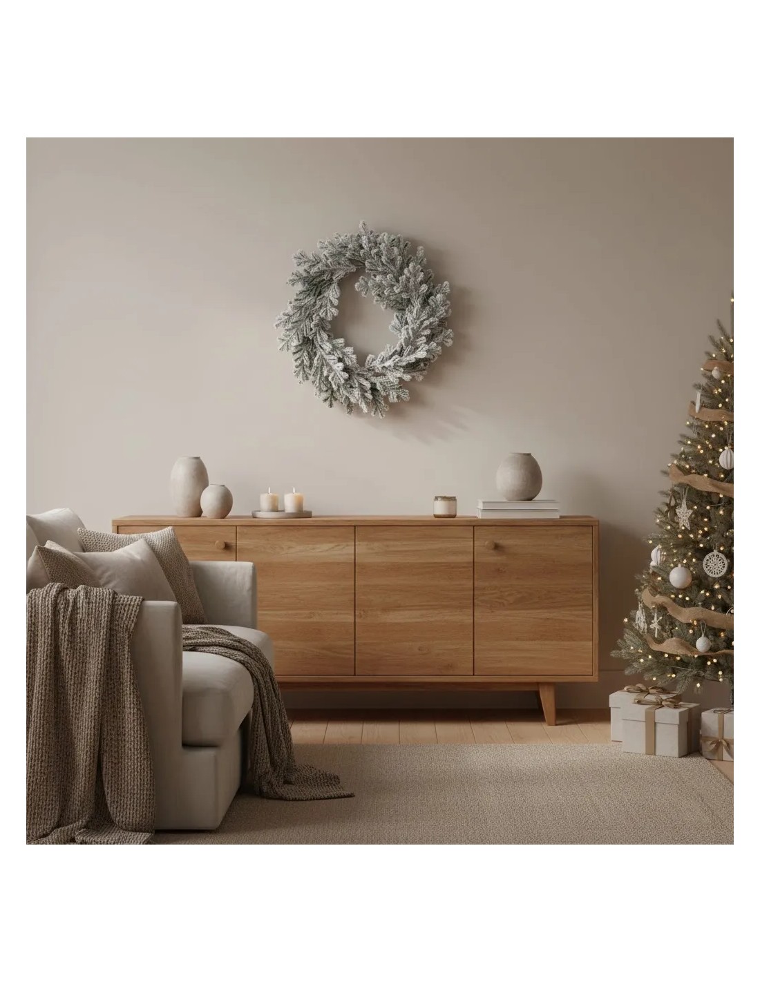 Con un diámetro de 32 cm, es ideal para colocar en puertas, paredes, recibidores o sobre muebles decorativos, tanto sola como combinada con otros elementos navideños en tonos neutros. Su diseño atemporal permite reutilizarla año tras año, adaptándose a estilos clásicos, nórdicos o contemporáneos.