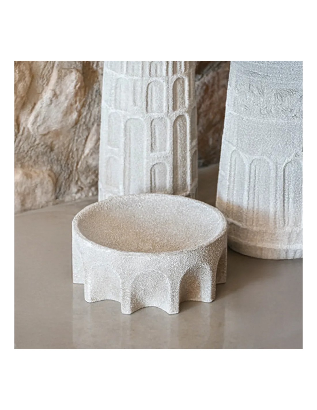 Centro de mesa de resina texturizada, con acabado rugoso que aporta carácter y un toque artesanal a la decoración. Ideal como pieza focal en mesas de comedor, consola o aparador.