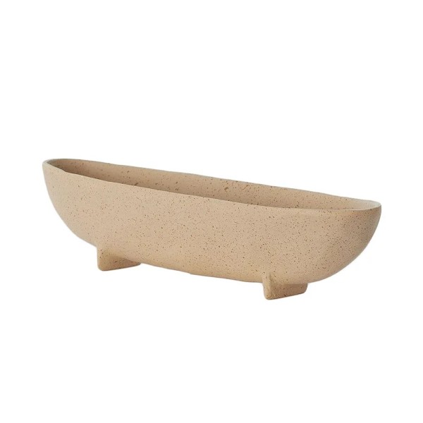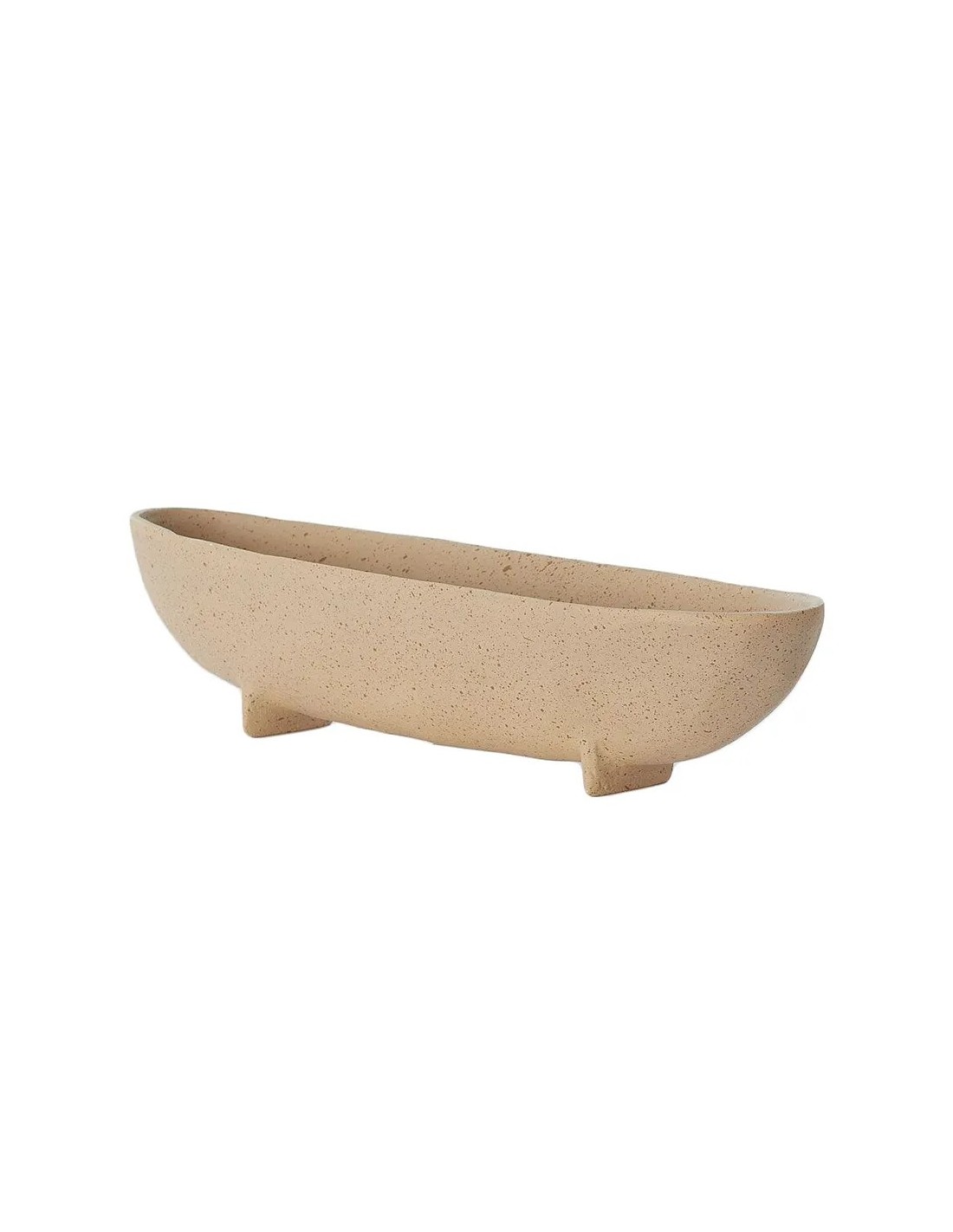 Bandeja metálica de 38x15 cm en tonos arena y marrón claro, con base elevada, ideal para aportar elegancia funcional a cualquier superficie.