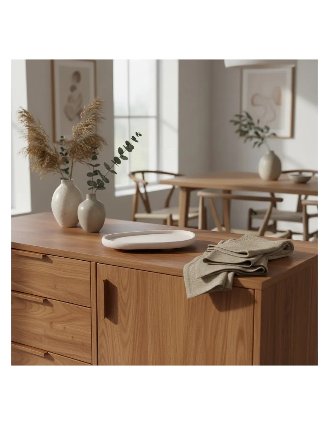 La base de madera eleva ligeramente la pieza, aportando contraste de materiales y estabilidad, además de reforzar su estética natural. Con unas medidas de 39 x 34 x 7 cm, es perfecta para decorar aparadores, mesas de centro o islas de cocina, permitiendo organizar velas, objetos decorativos o pequeños accesorios con elegancia.