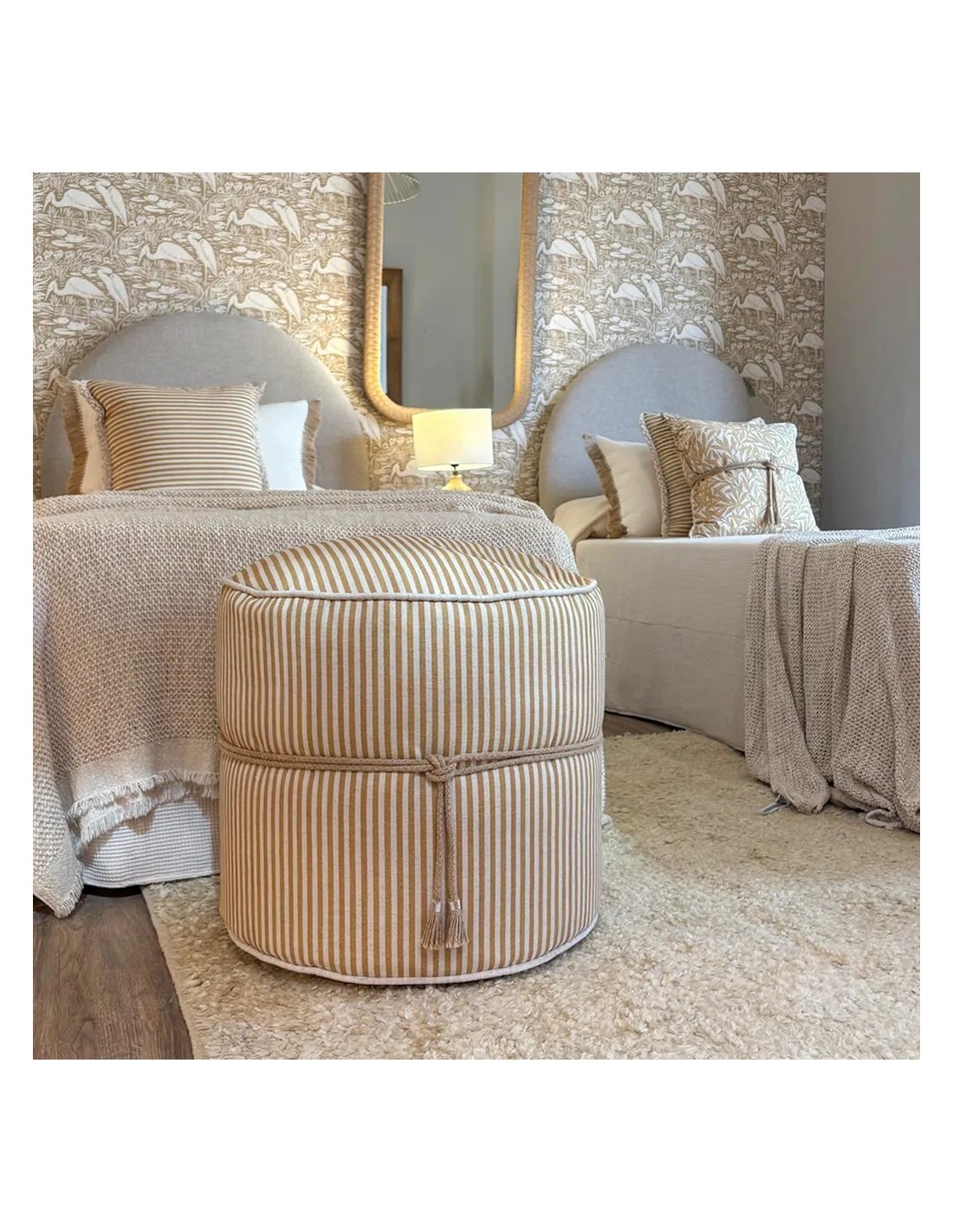 Pouff redondo con rayas en tonos ocre y detalle de nudo en yute. Estilo bohemio y textura natural.