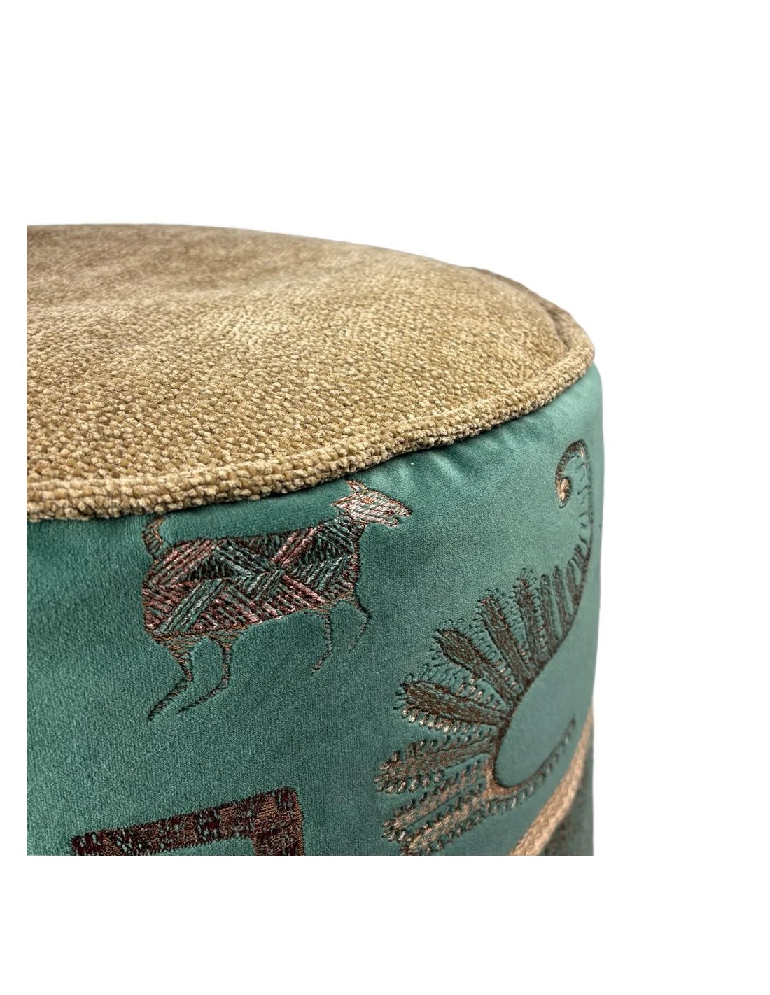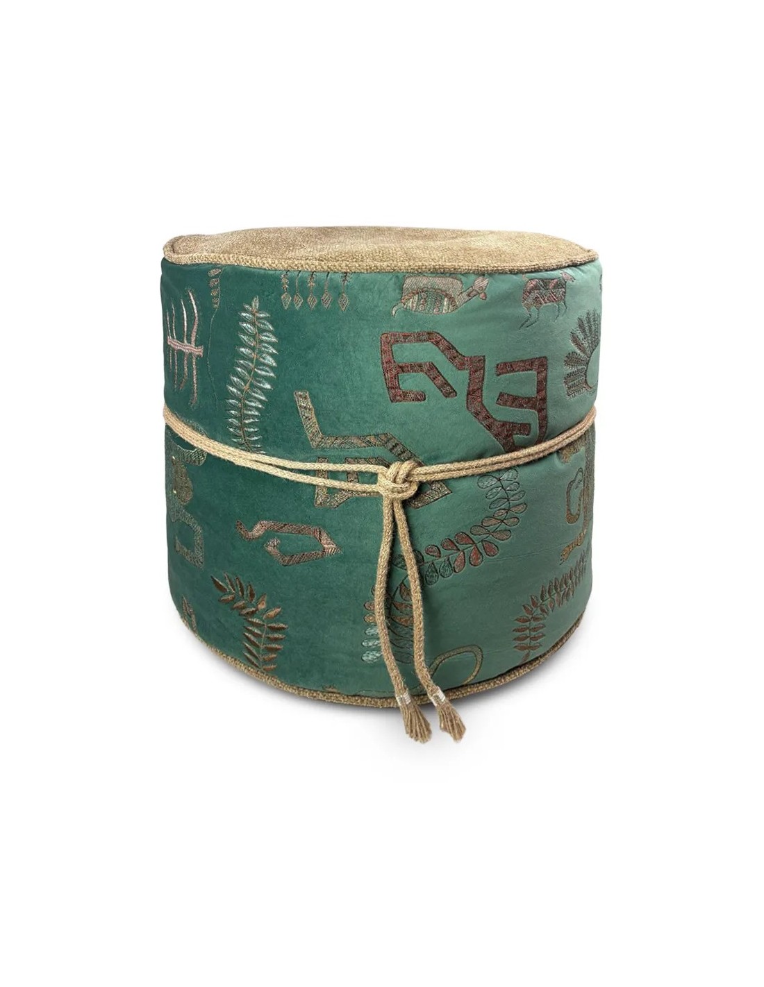 Pouff redondo en verde oscuro con bordado decorativo y cordón de yute. Estilo natural y elegante.