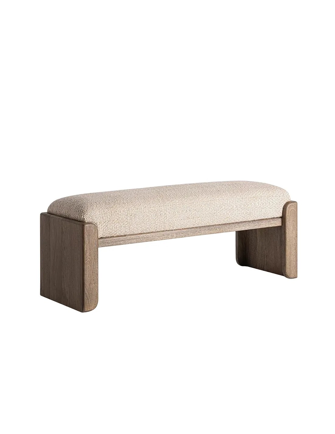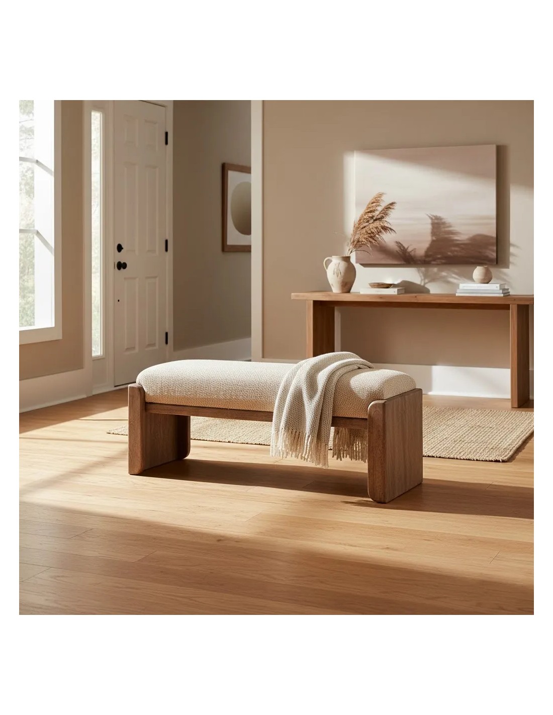 Con unas medidas de 122 cm de ancho, 40 cm de fondo y 48 cm de alto, es ideal para colocar a los pies de la cama, en un recibidor amplio o como asiento auxiliar decorativo. Su diseño encaja fácilmente en interiores contemporáneos, rústicos o mediterráneos.