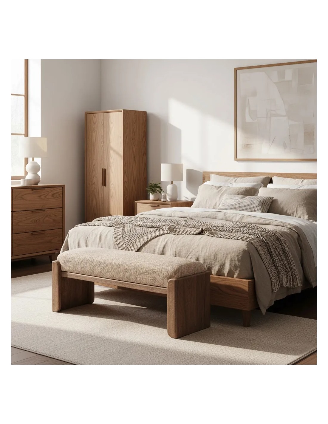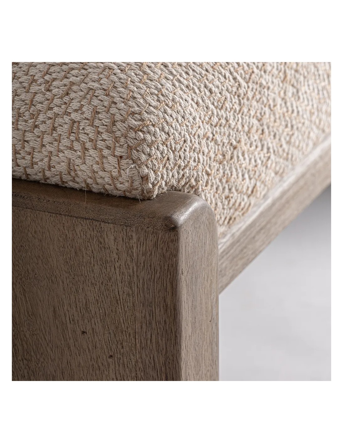 Banqueta de pie de cama con estructura de madera de mango y asiento tapizado en yute natural, una pieza funcional y elegante que aporta calidez y equilibrio a cualquier dormitorio.