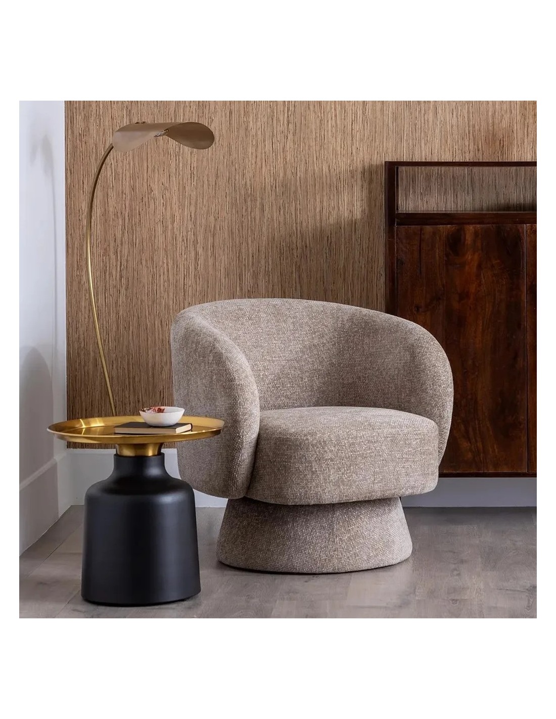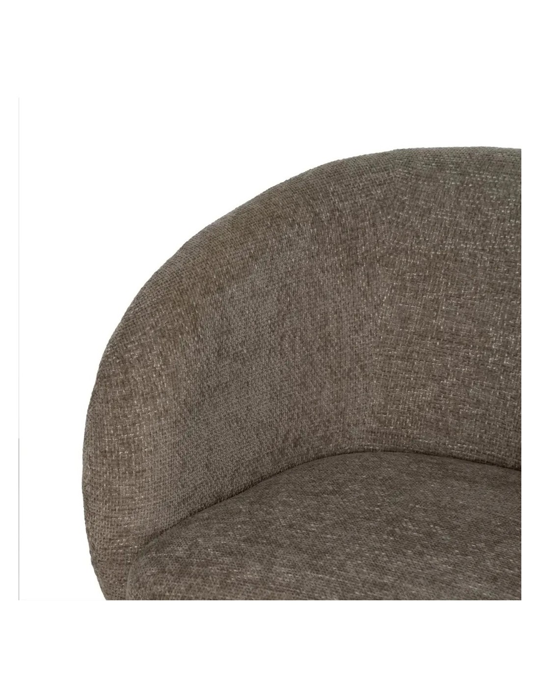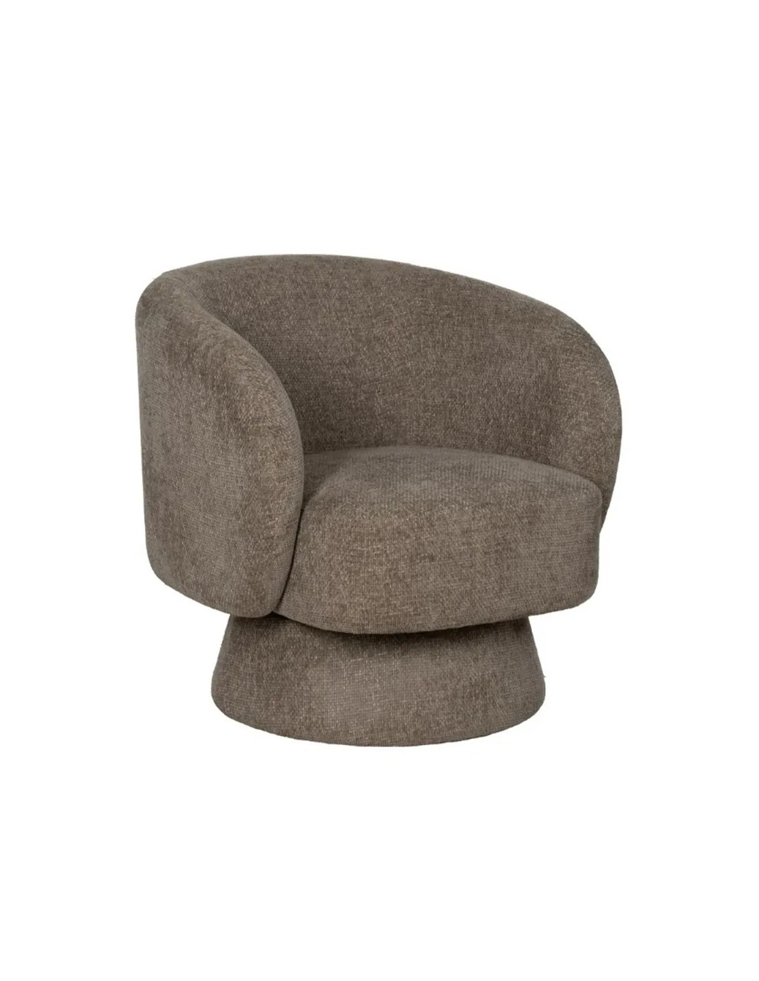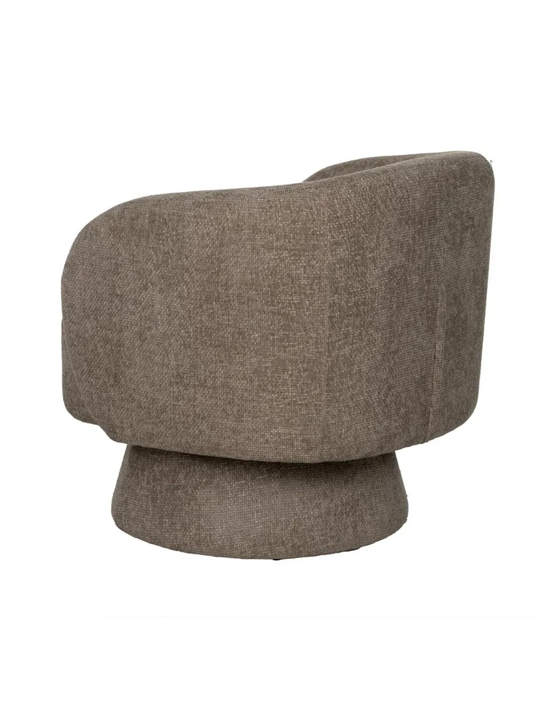 Sillón redondo giratorio tapizado en tejido topo lavable. Diseño envolvente y cómodo, ideal para cualquier rincón.