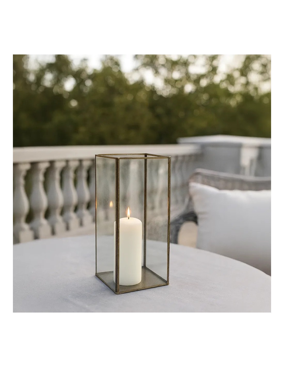 Portavelas rectangular de cristal con borde en metal bronce. Elegancia geométrica con reflejos cálidos y diseño atemporal.
