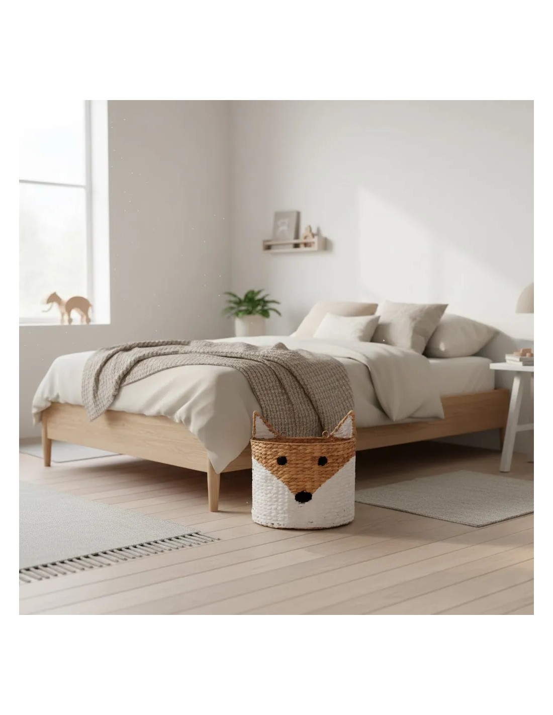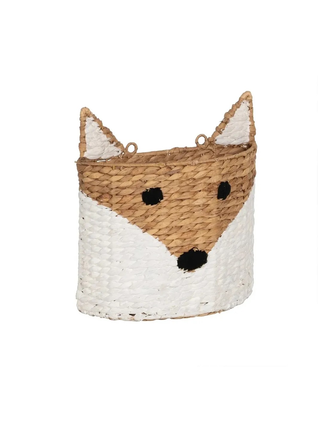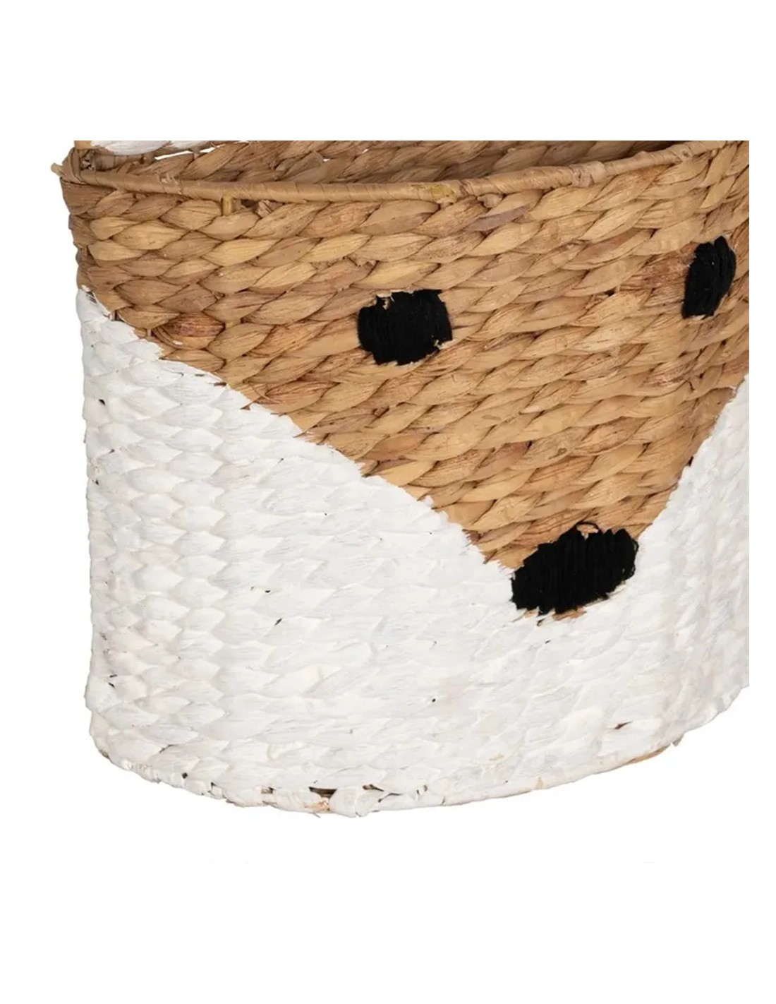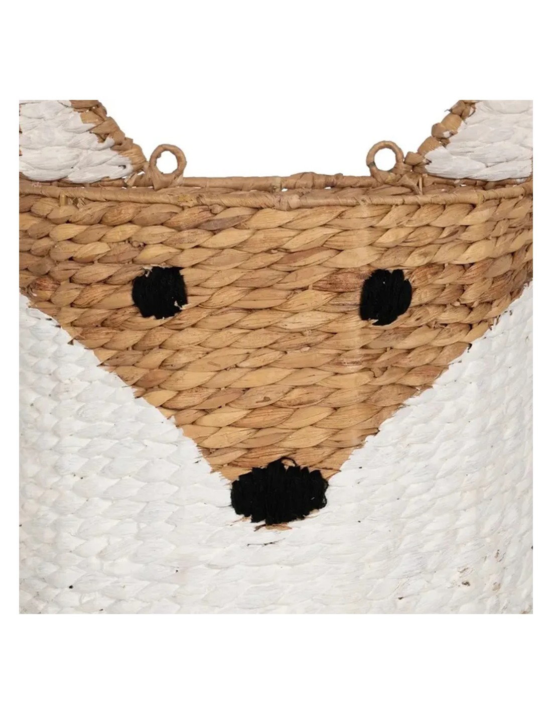 Cesto infantil decorativo fabricado en fibra natural, con diseño de zorro en tonos blanco y natural. Ideal para almacenaje y decoración.