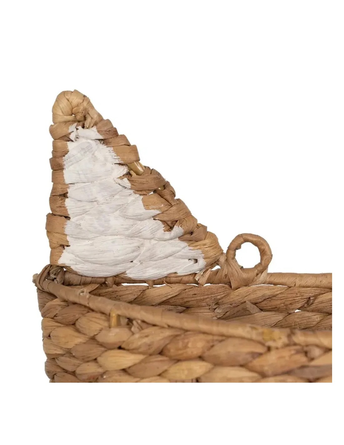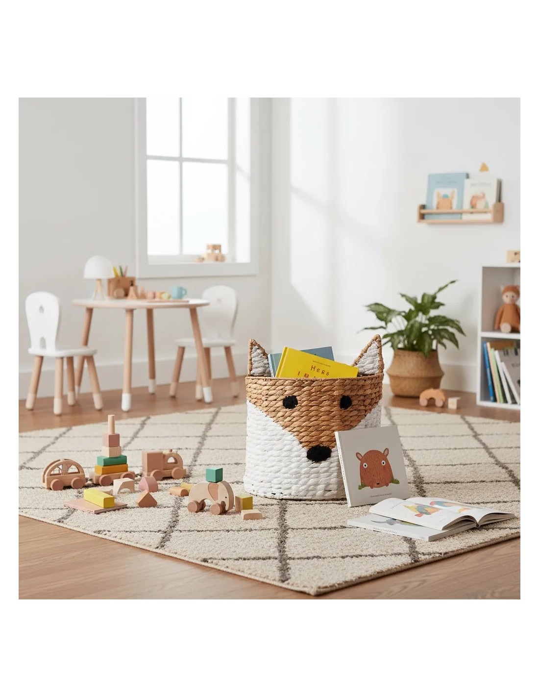 Cesto infantil decorativo elaborado en fibra natural trenzada, con un original diseño de zorro que aporta un toque lúdico y acogedor a dormitorios infantiles o zonas de juego. La combinación de fibras en tono natural y blanco crea una estética suave y neutra, fácil de integrar en distintos estilos decorativos.