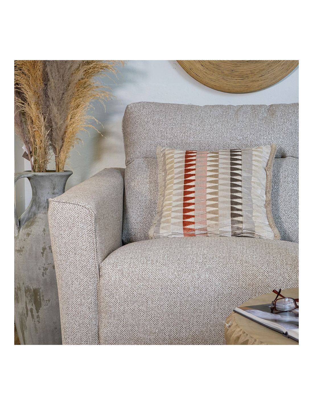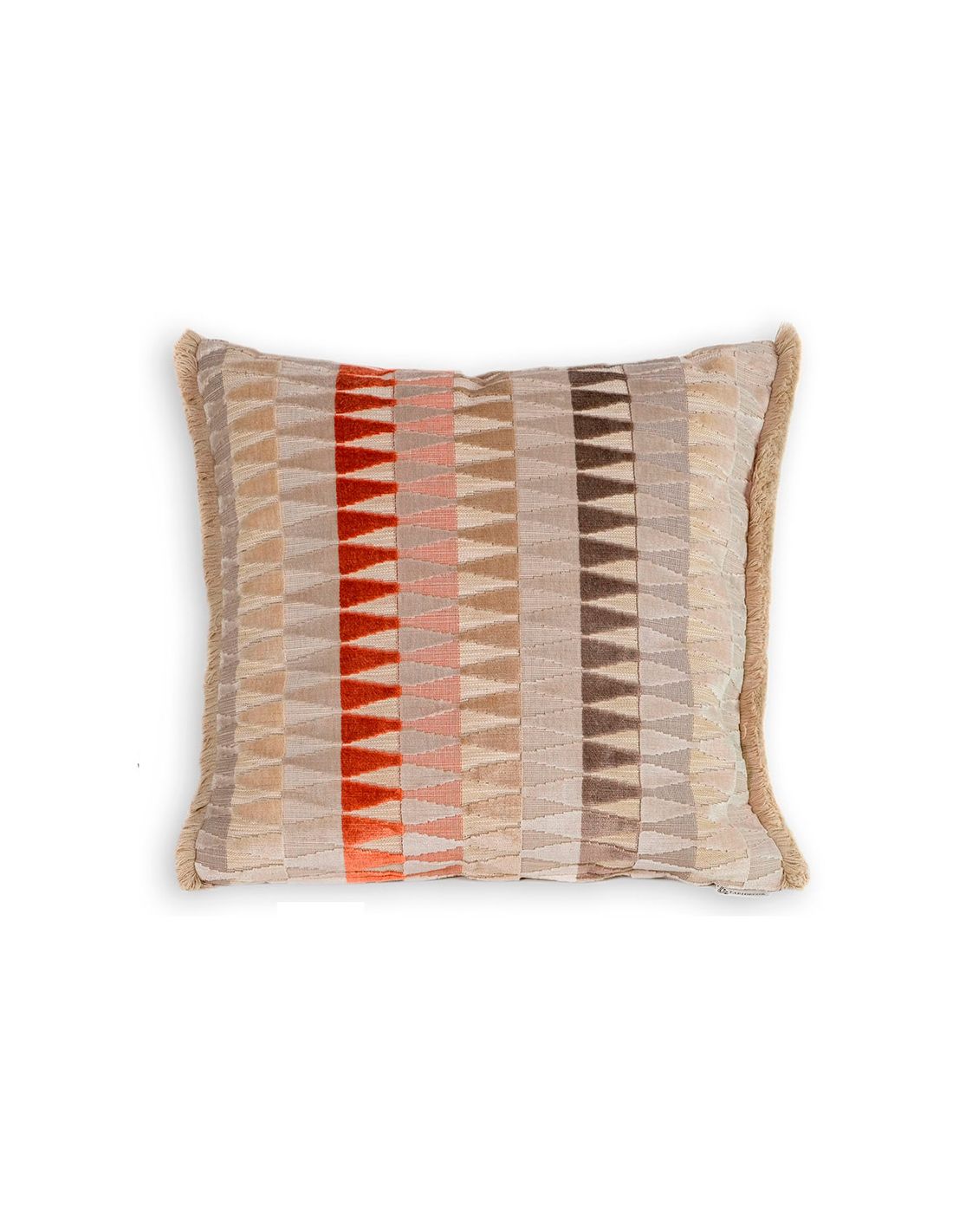 Cojín decorativo para cama o sofá 50x50 cm, Relleno Premium efecto Pluma incluido, tejido aterciopelado diseño geométrico triángulos con franjas en tonos beige, marrones, grises y un toque de color en naranja cálido, Fleco aena. Descubre el confort supremo con nuestros cojines Tapidecor, diseñados para crear un ambiente único y exclusivo en tu dormitorio o salón.