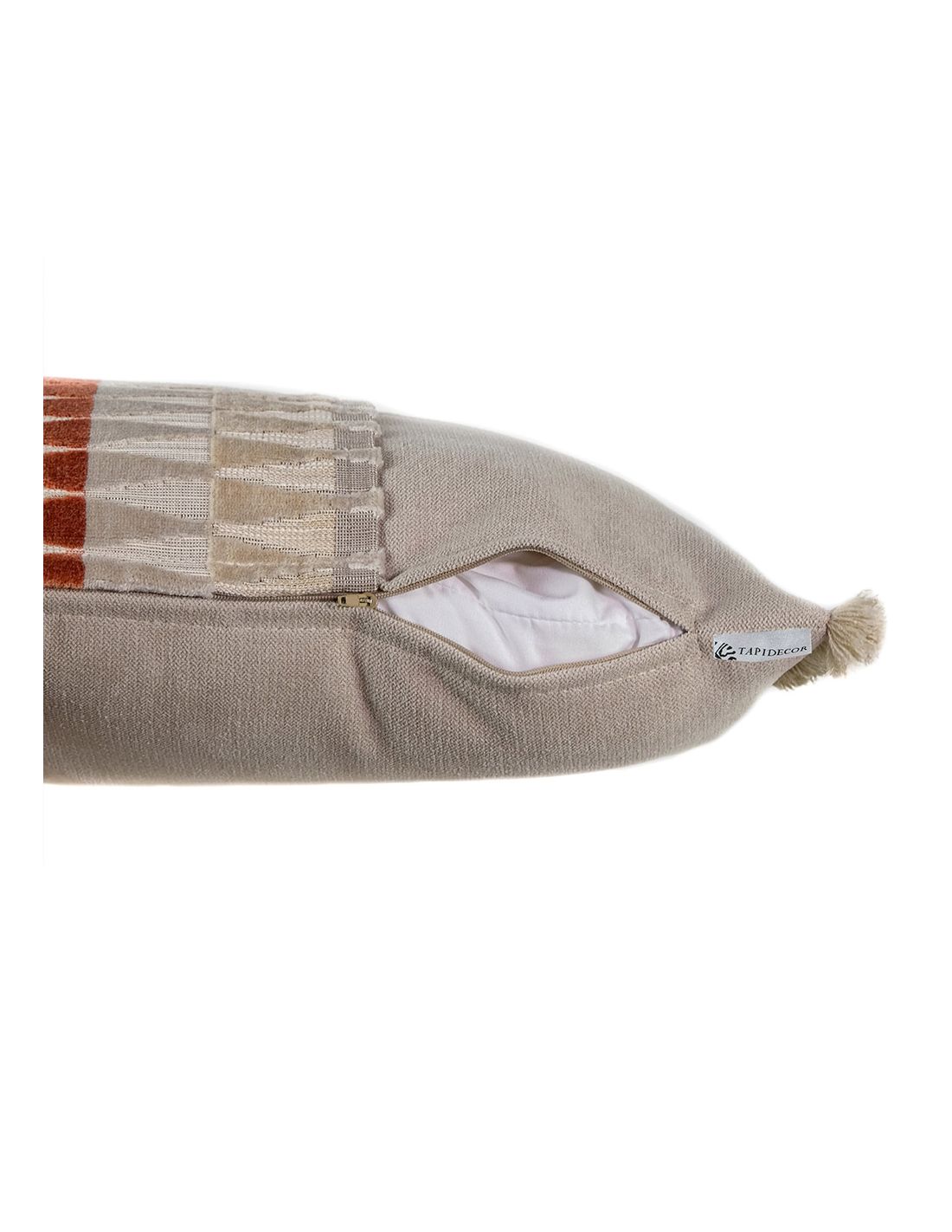 Cojín geométrico naranja beige fleco arena con relleno premium 50x50