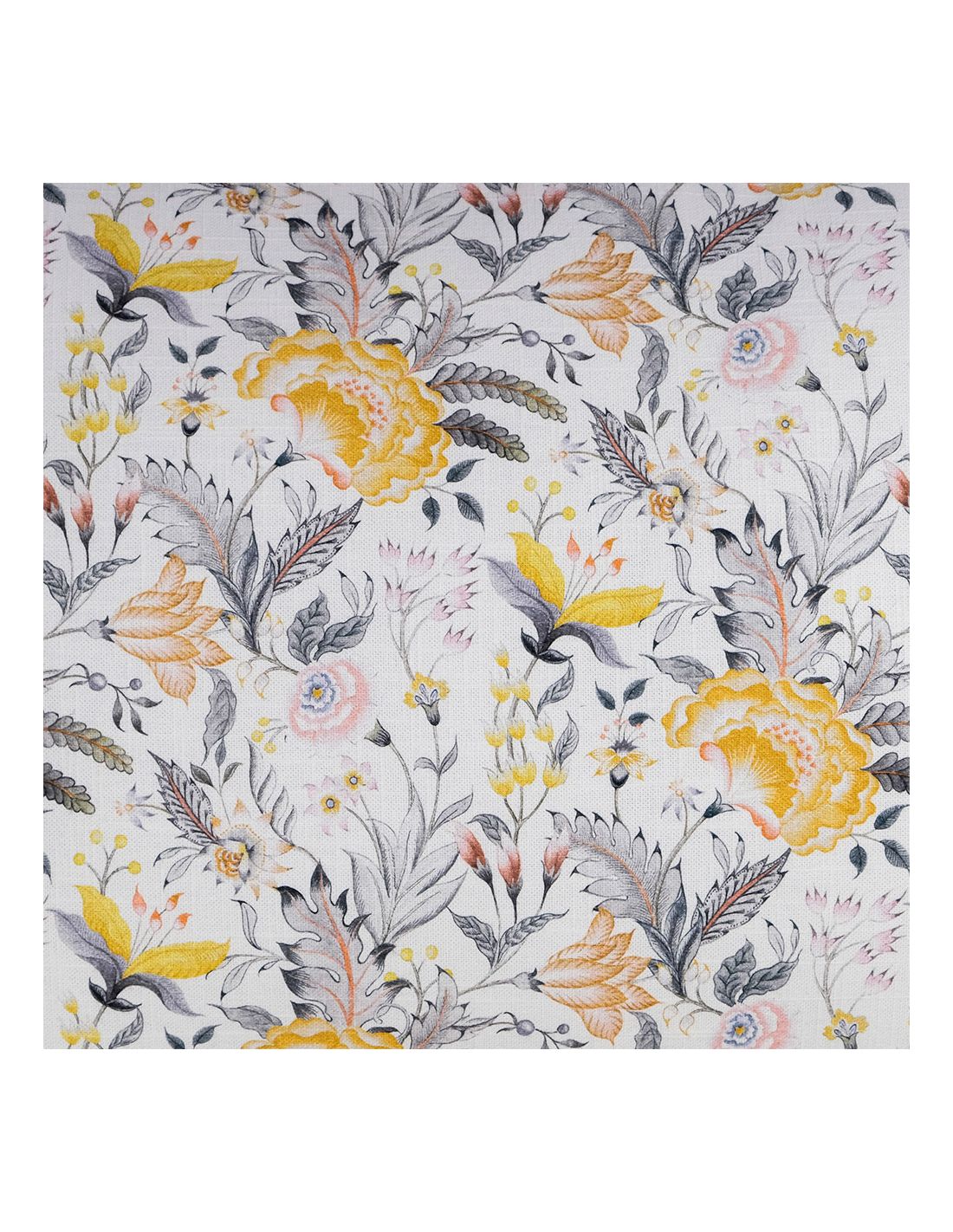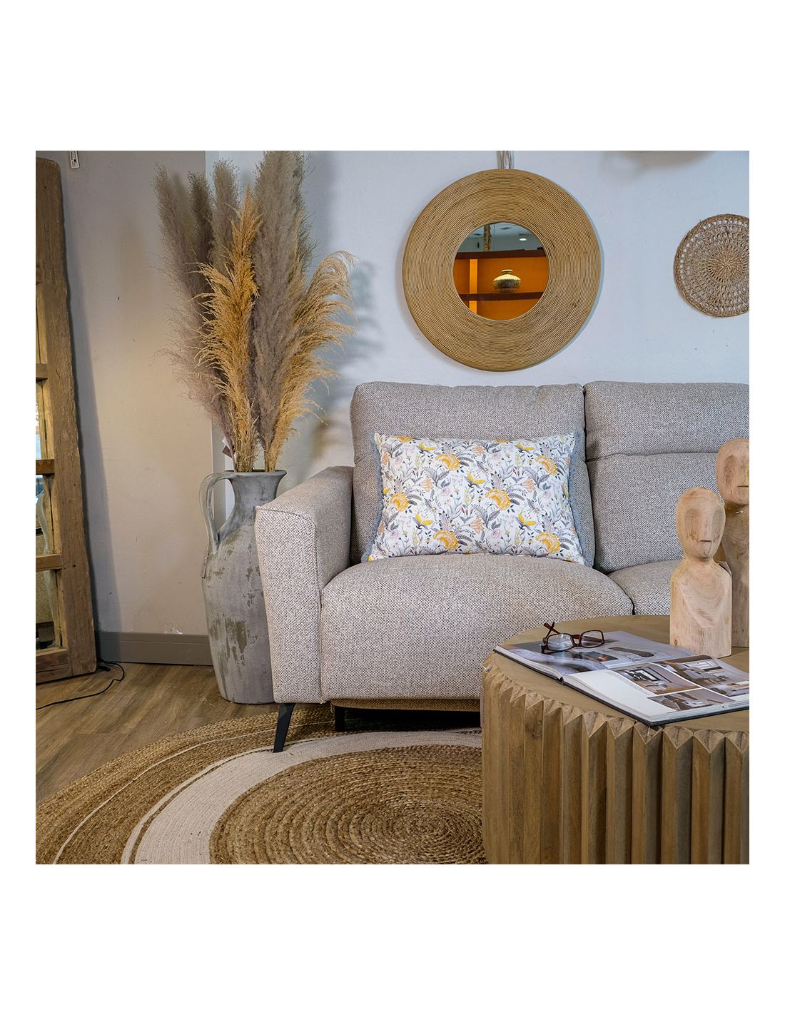 Cojín decorativo para cama o sofá 70x50 cm, Relleno Premium efecto Pluma incluido, tejido estampado flores amarillas y grises sobre fondo beige, Fleco gris. Descubre el confort supremo con nuestros cojines Tapidecor, diseñados para crear un ambiente único y exclusivo en tu dormitorio o salón.