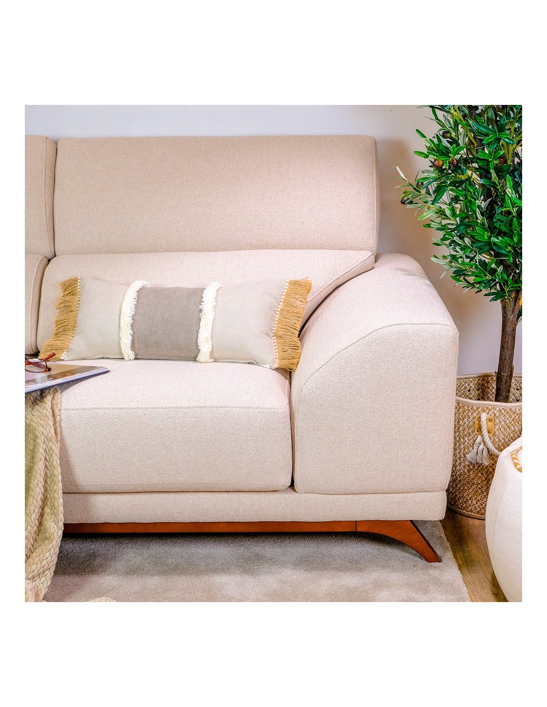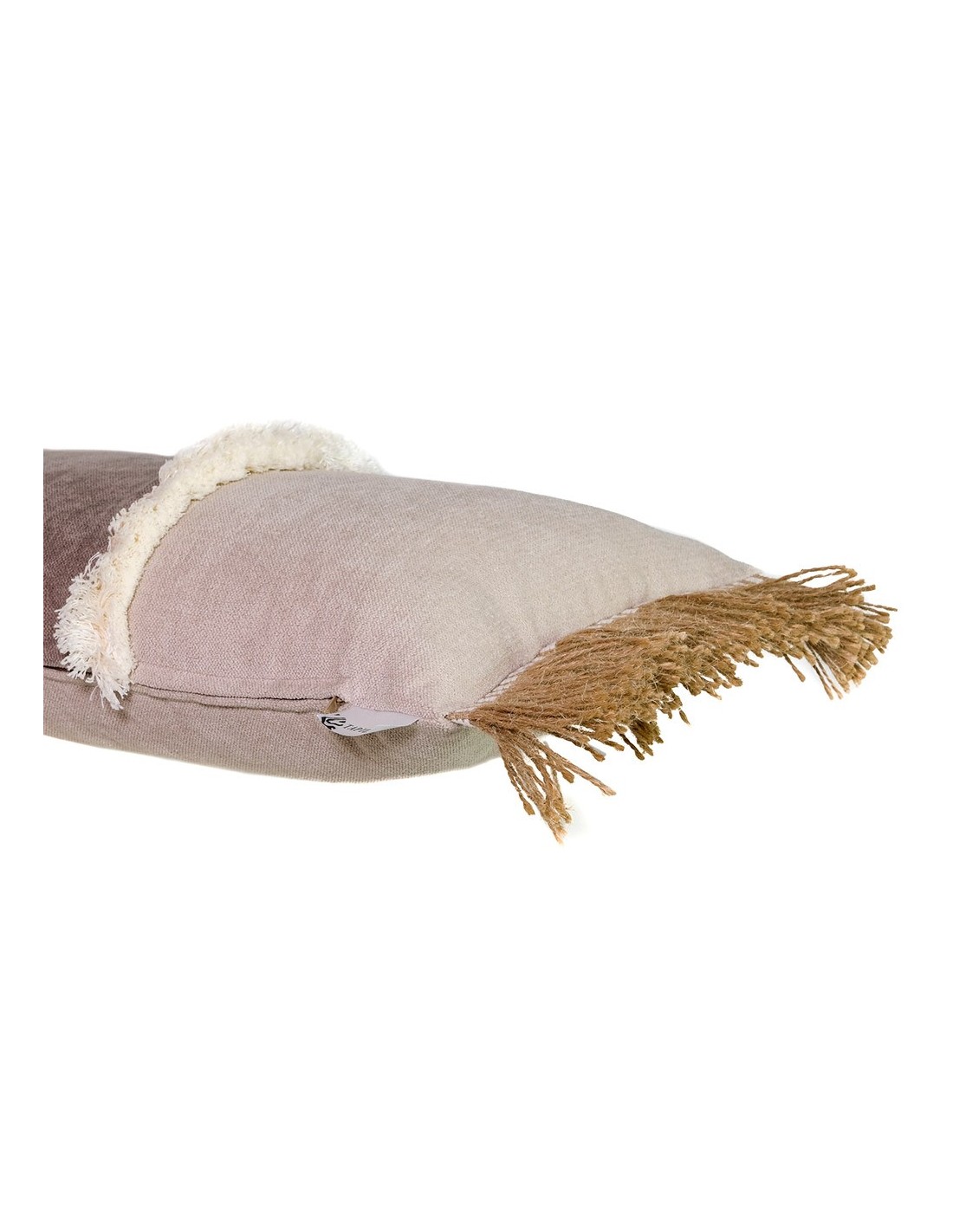 Este cojín decorativo rectangular de 60x30 cm combina el suave tono arena con una banda en color topo y detalles de flecos de rafia. Fabricado con materiales de alta calidad, su diseño elegante y natural es perfecto para aportar un aire de serenidad y sofisticación a cualquier espacio. Ideal para complementar cualquier estilo decorativo, este cojín es una opción versátil y chic.