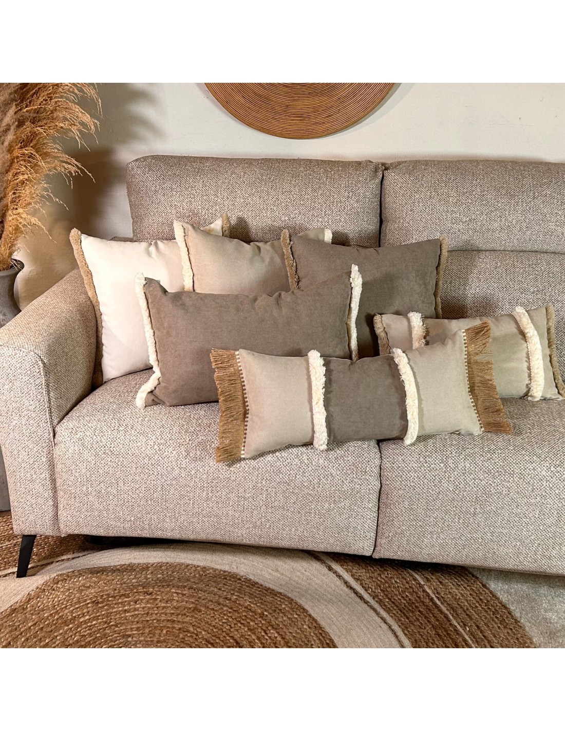 Cojín rectangular de 60x30 cm en tono arena con banda topo y flecos de rafia, ideal para añadir un toque natural y elegante a tu sofá o cama.