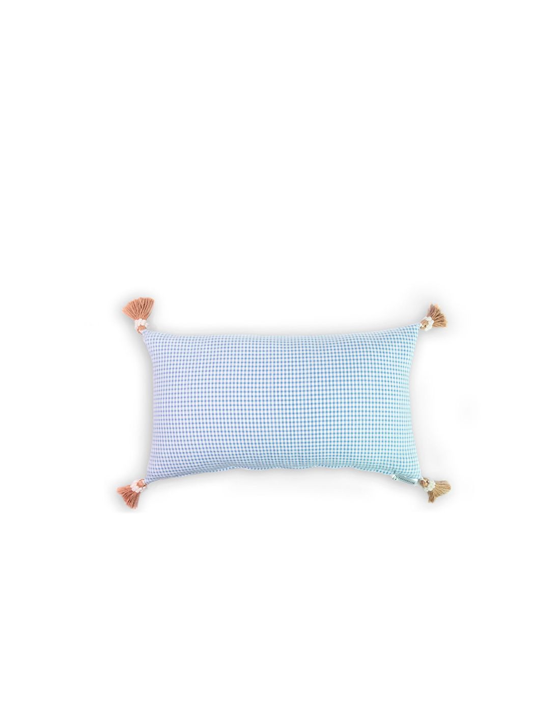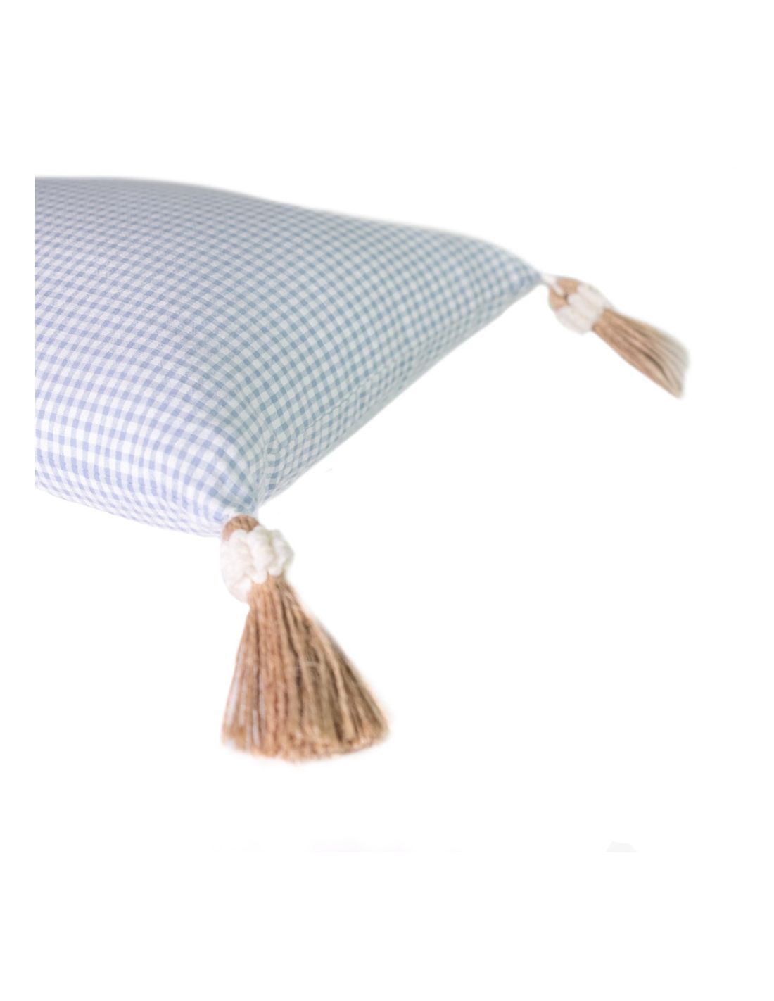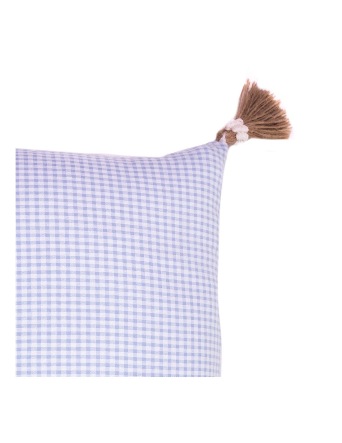 Cojín Vichy azul borlas rafia con relleno premium 50x30