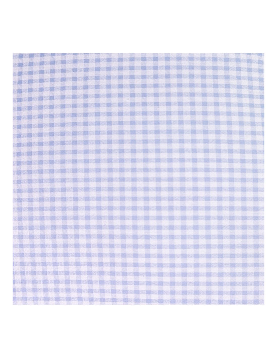 Cojín de tela Vichy azul con pompones en las esquinas, elegante y cómodo.