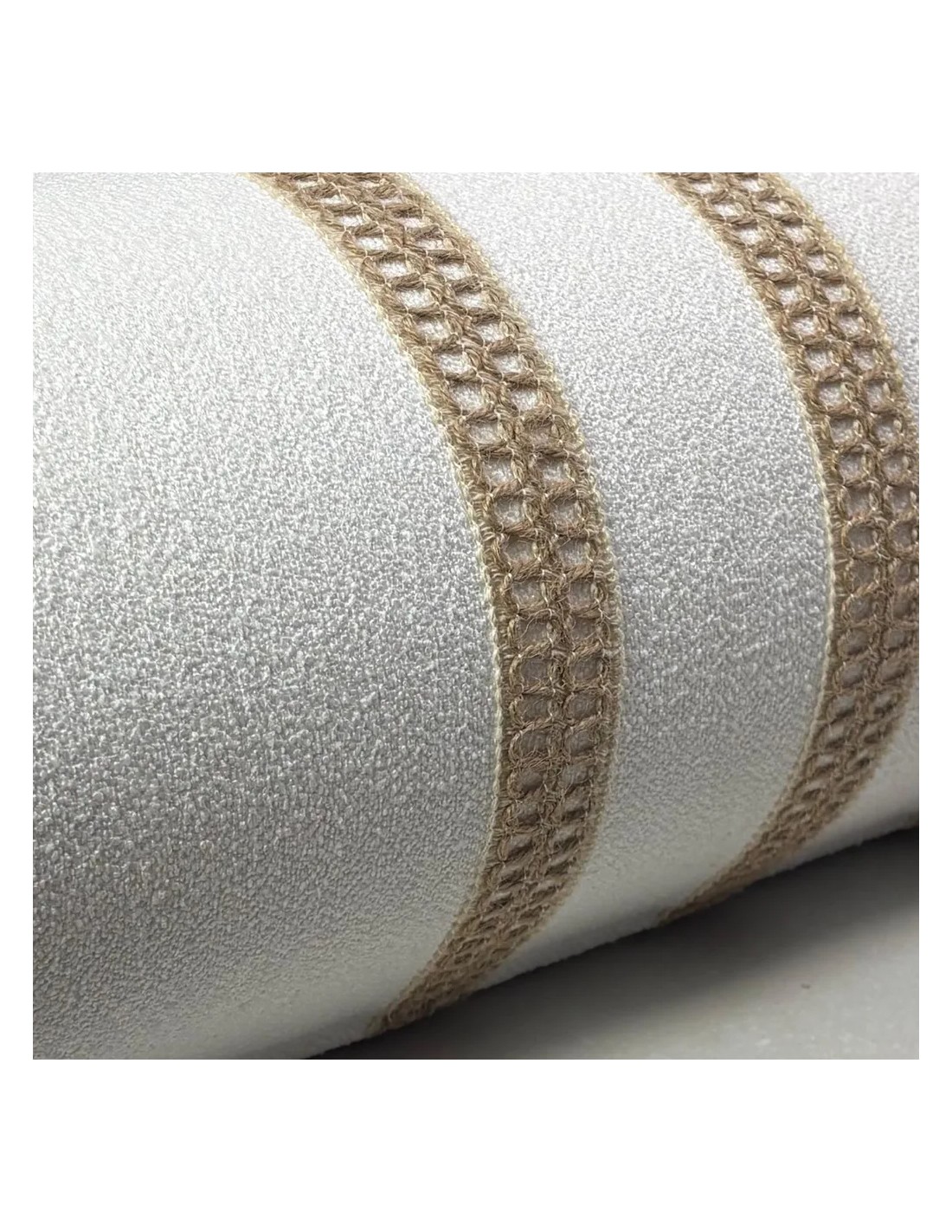 Cojín cilíndrico redondo de 70x20 cm en blanco con rayas camel y relleno Premium incluido. Diseño envolvente con aire gráfico y textura suave.