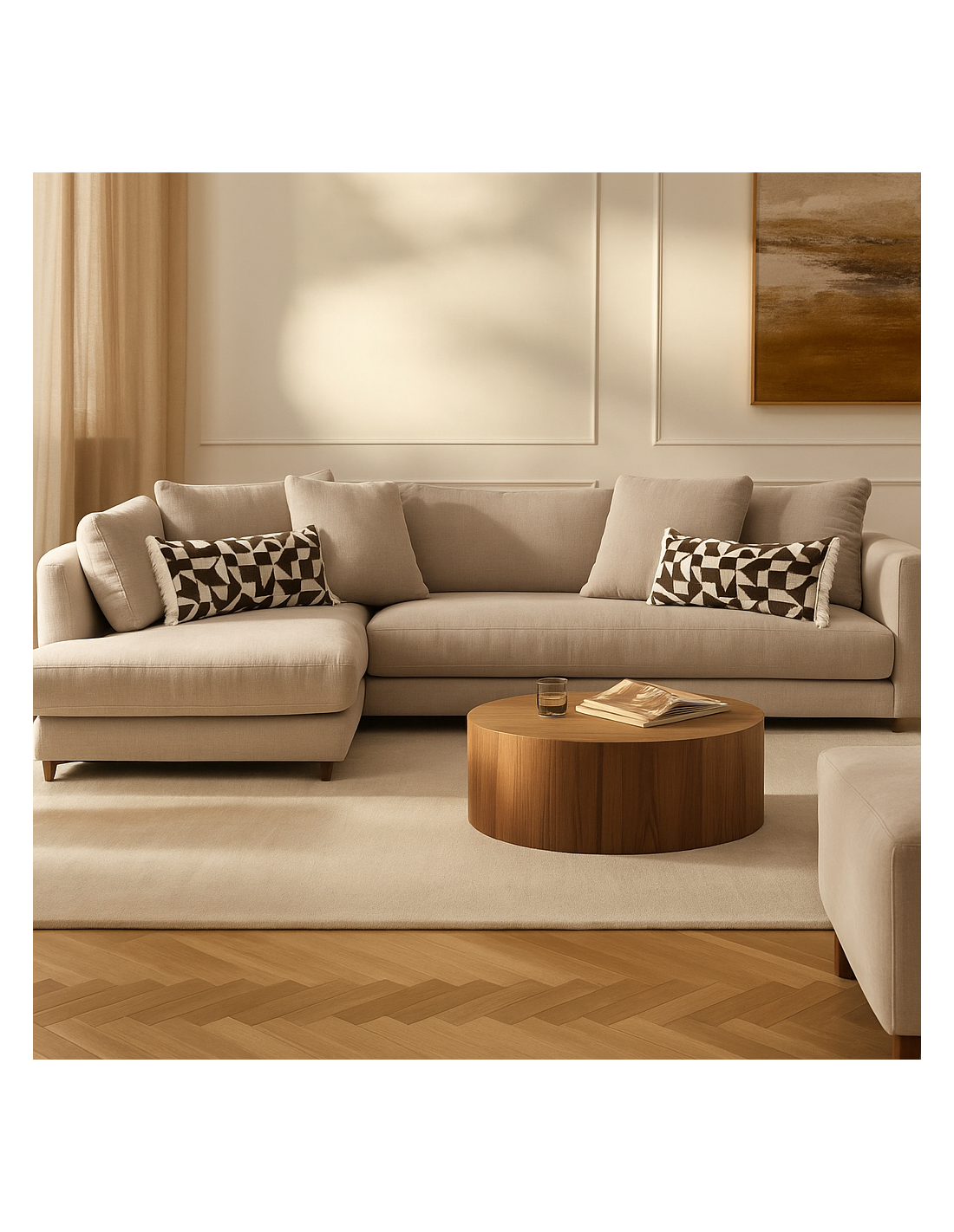 Este cojín beige de 60x30 cm destaca por su diseño geométrico y delicados flecos de espumillón, aportando textura y sofisticación. Ideal para dar calidez y estilo a cualquier espacio, combinando funcionalidad y belleza en un solo accesorio.