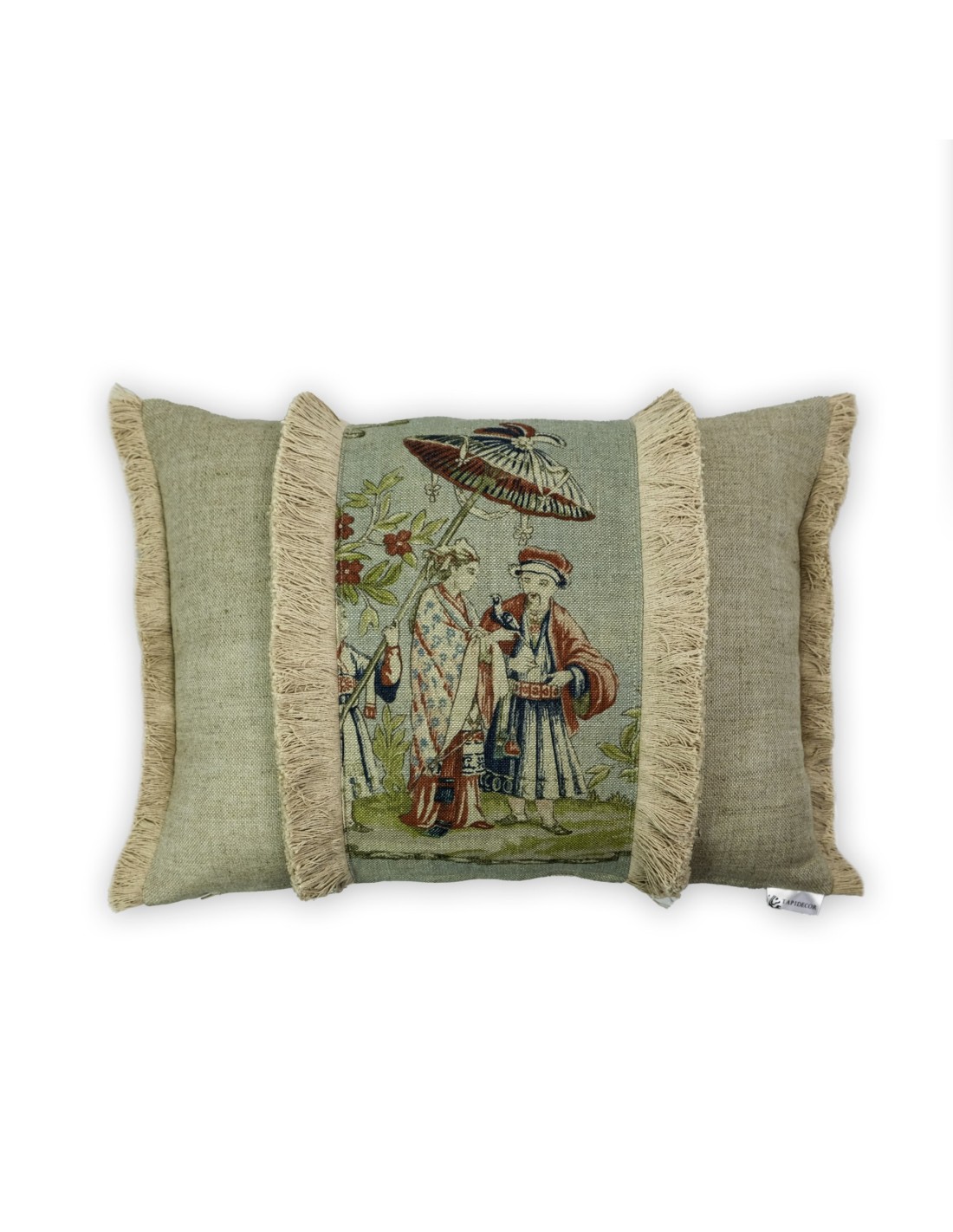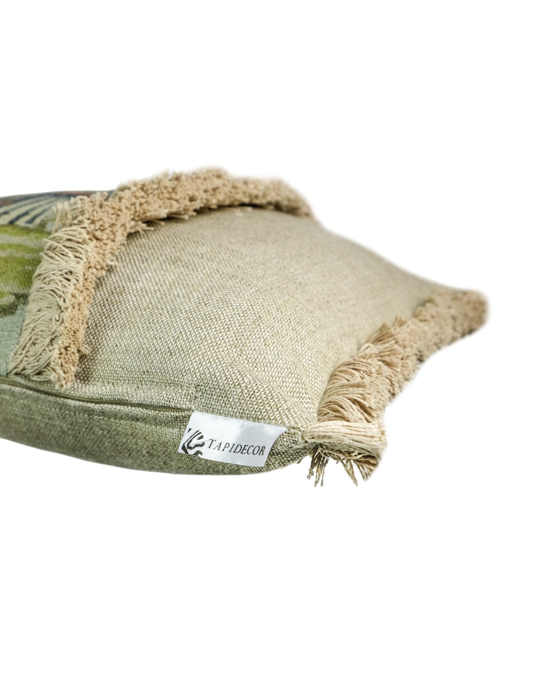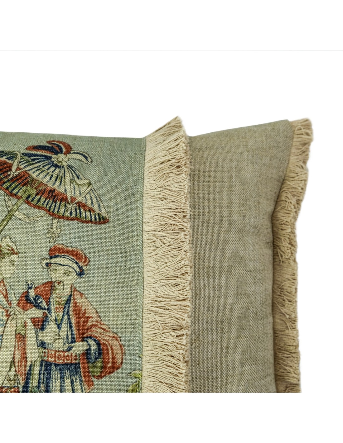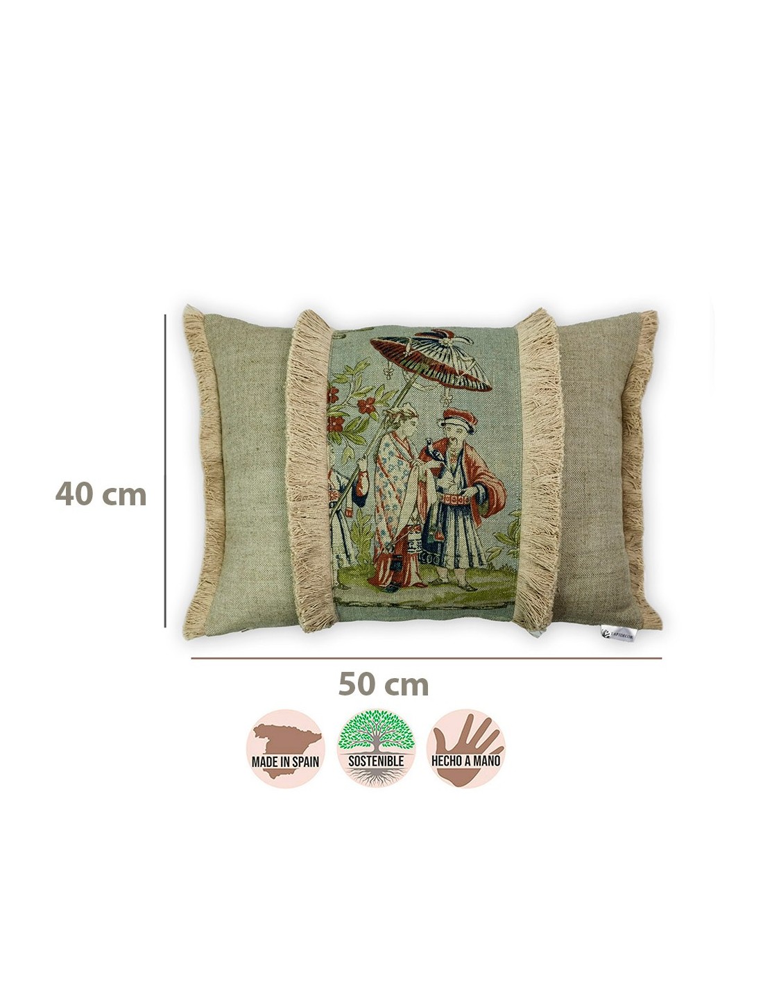 Cojín verde doble flecos banda motivos chinos relleno premium 50X40
