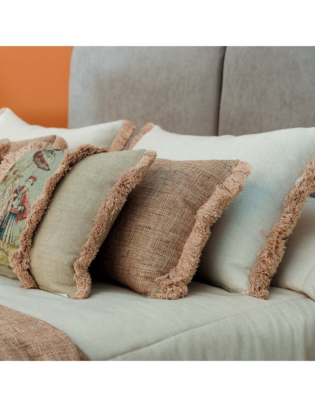Este cojín decorativo combina un tono verde profundo con doble fleco en los bordes y centro y una banda central con motivos chinos, aportando textura y carácter a cualquier ambiente. El diseño incluye una banda estampada, cuyo motivo puede variar ligeramente según el corte de la tela, lo que convierte cada pieza en única. Ideal para sofás, camas o sillones, añade un toque exótico y refinado a la decoración.