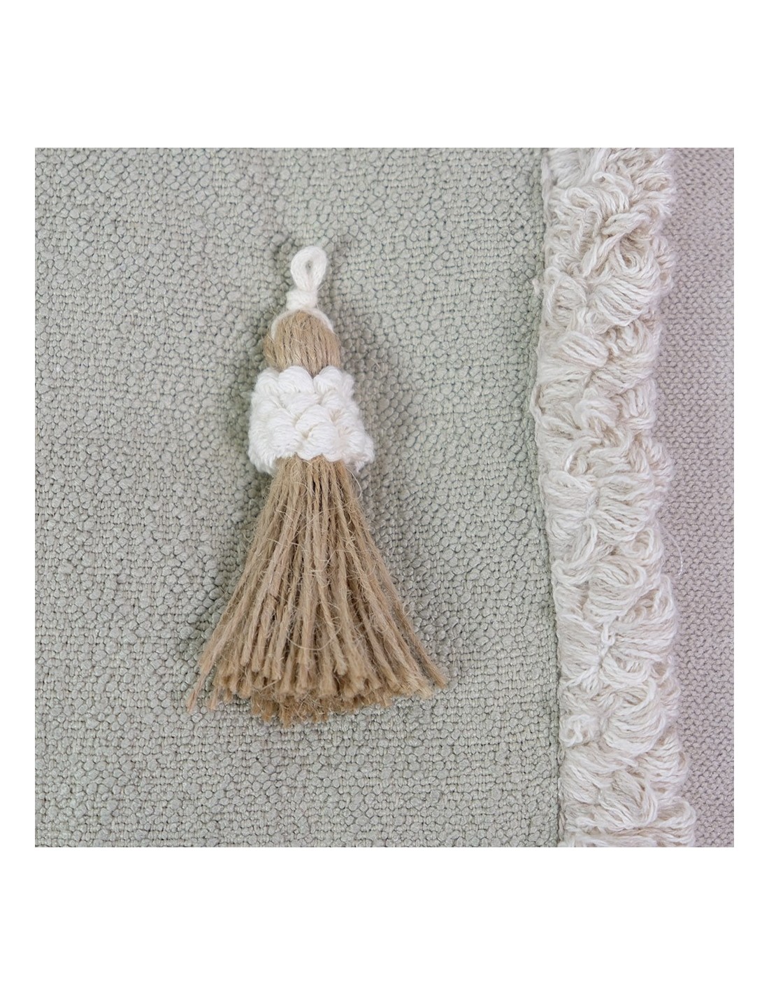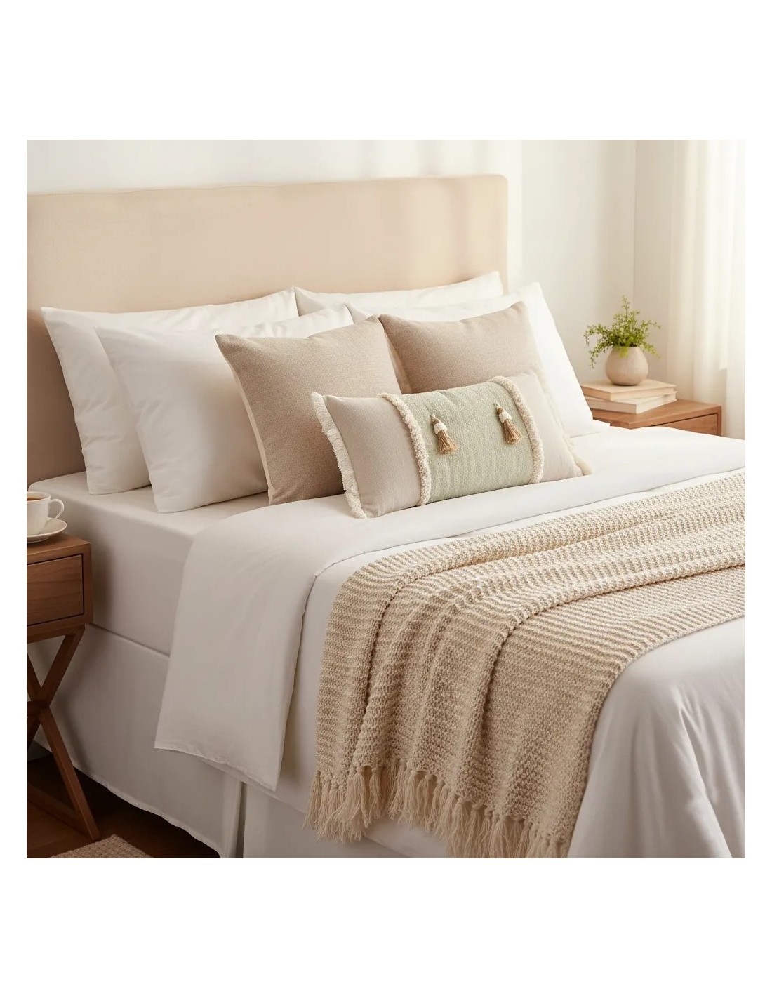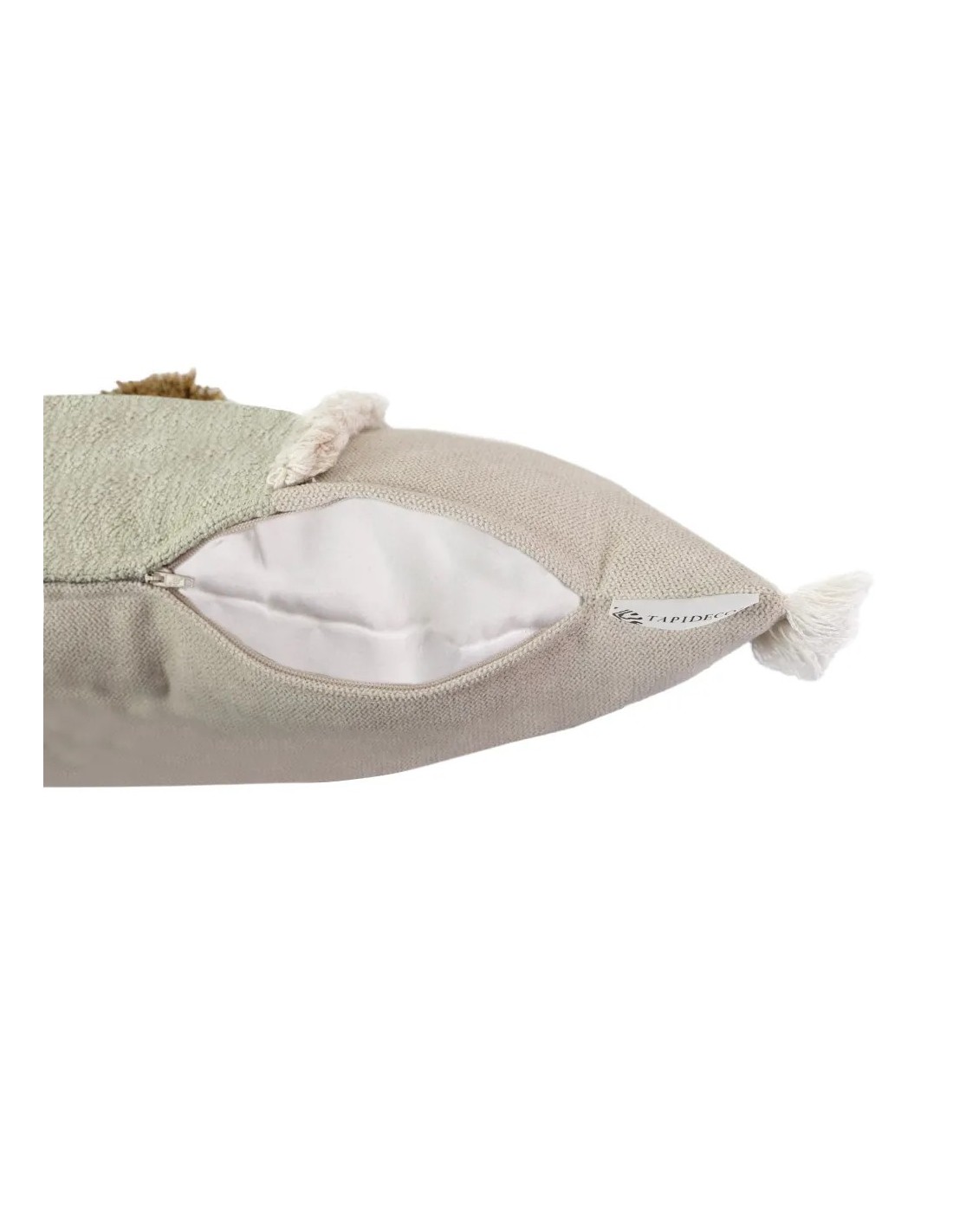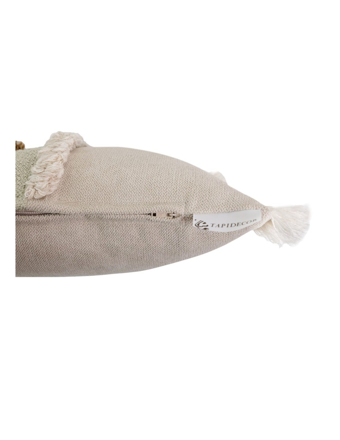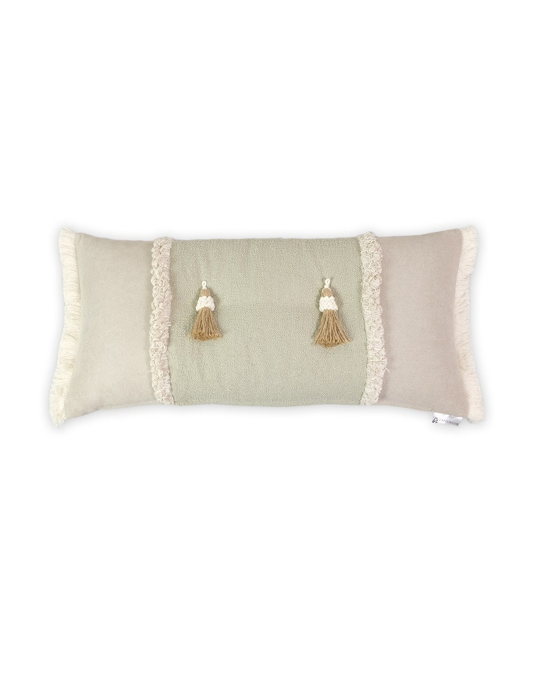 Cojín rectangular con flecos laterales y borlones centrales, en tonos suaves beige y verde, ideal para añadir un toque elegante y artesanal a tu sofá o cama.