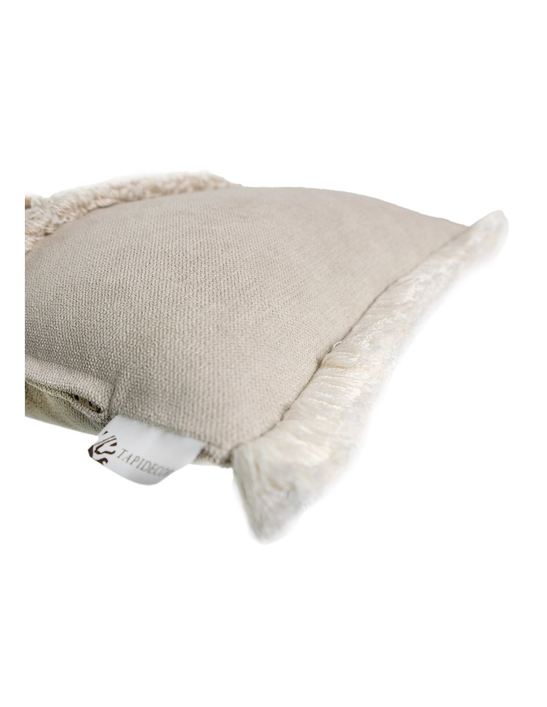 Este cojín rectangular combina la delicadeza de los tonos beige y verde con detalles artesanales de flecos laterales y borlones centrales, creando un acabado sofisticado y armonioso. Confeccionado cuidadosamente a mano, su textura suave y su diseño equilibrado aportan calidez y estilo a cualquier espacio, desde un salón contemporáneo hasta un dormitorio refinado. Perfecto para combinar con otros cojines lisos o estampados, logrando un ambiente elegante, acogedor y digno de una revista de interiorismo.