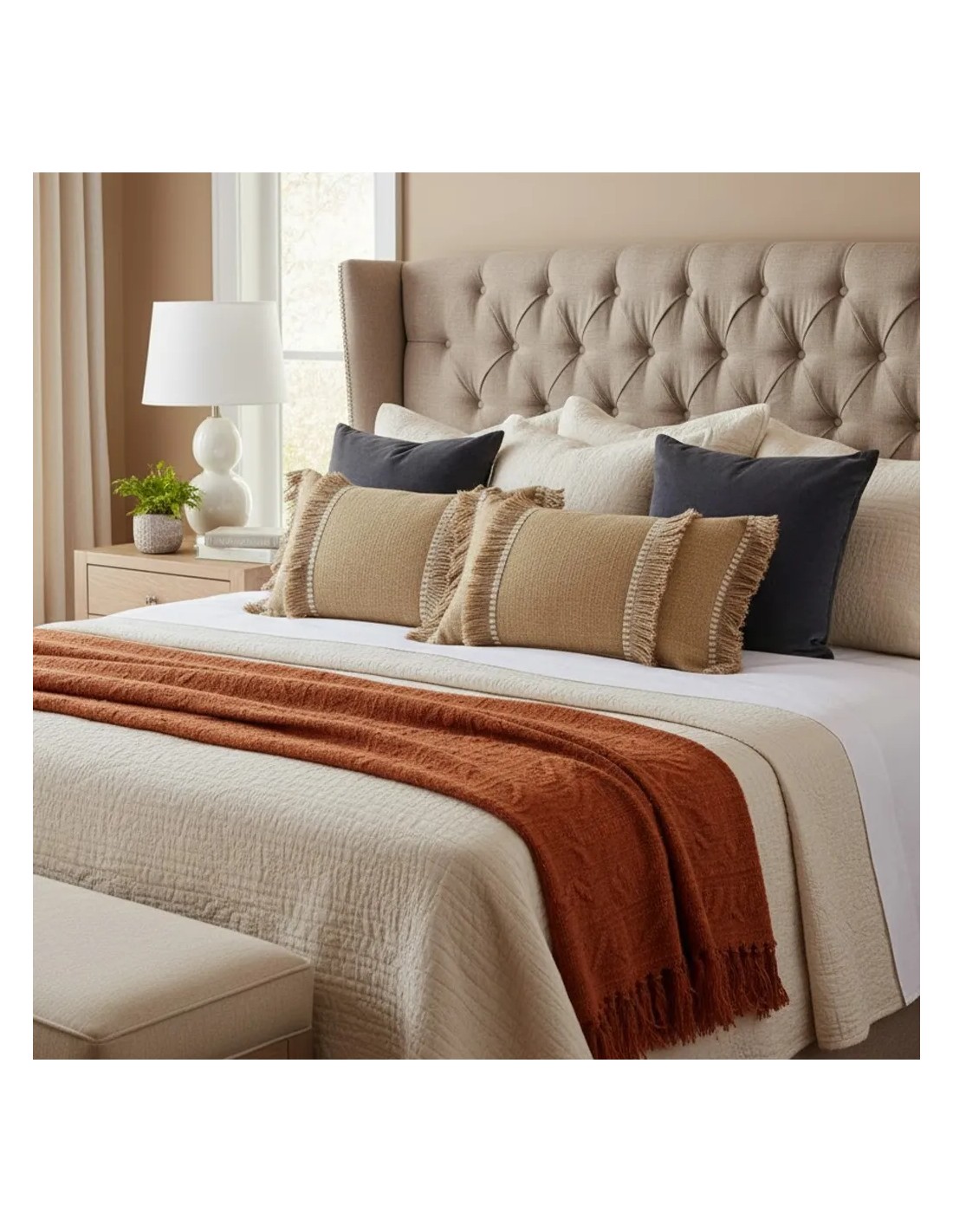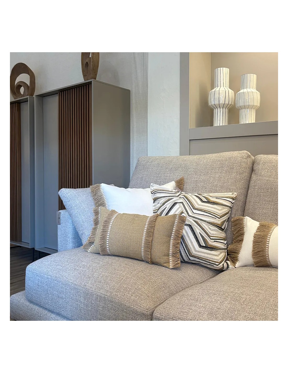Cojín camel doble fleco con relleno premium incluido ofrece una sensación de confort inigualable. Con su agradable textura y estilo versátil, este cojín aportará un impacto visual a cualquier espacio de tu casa.