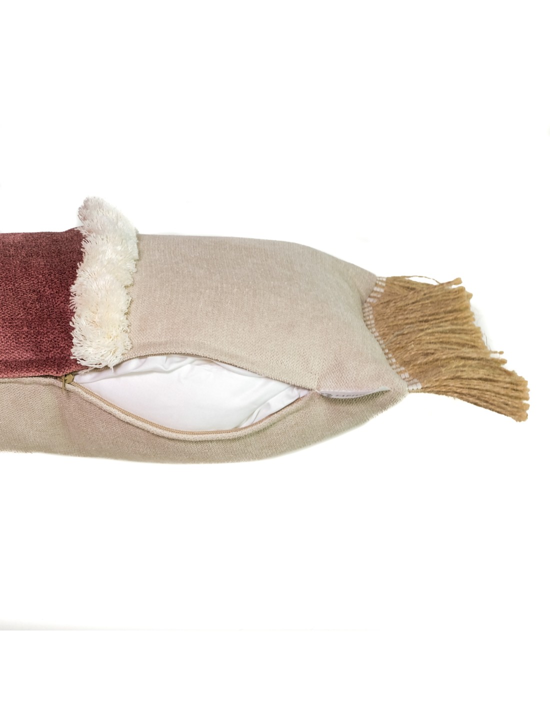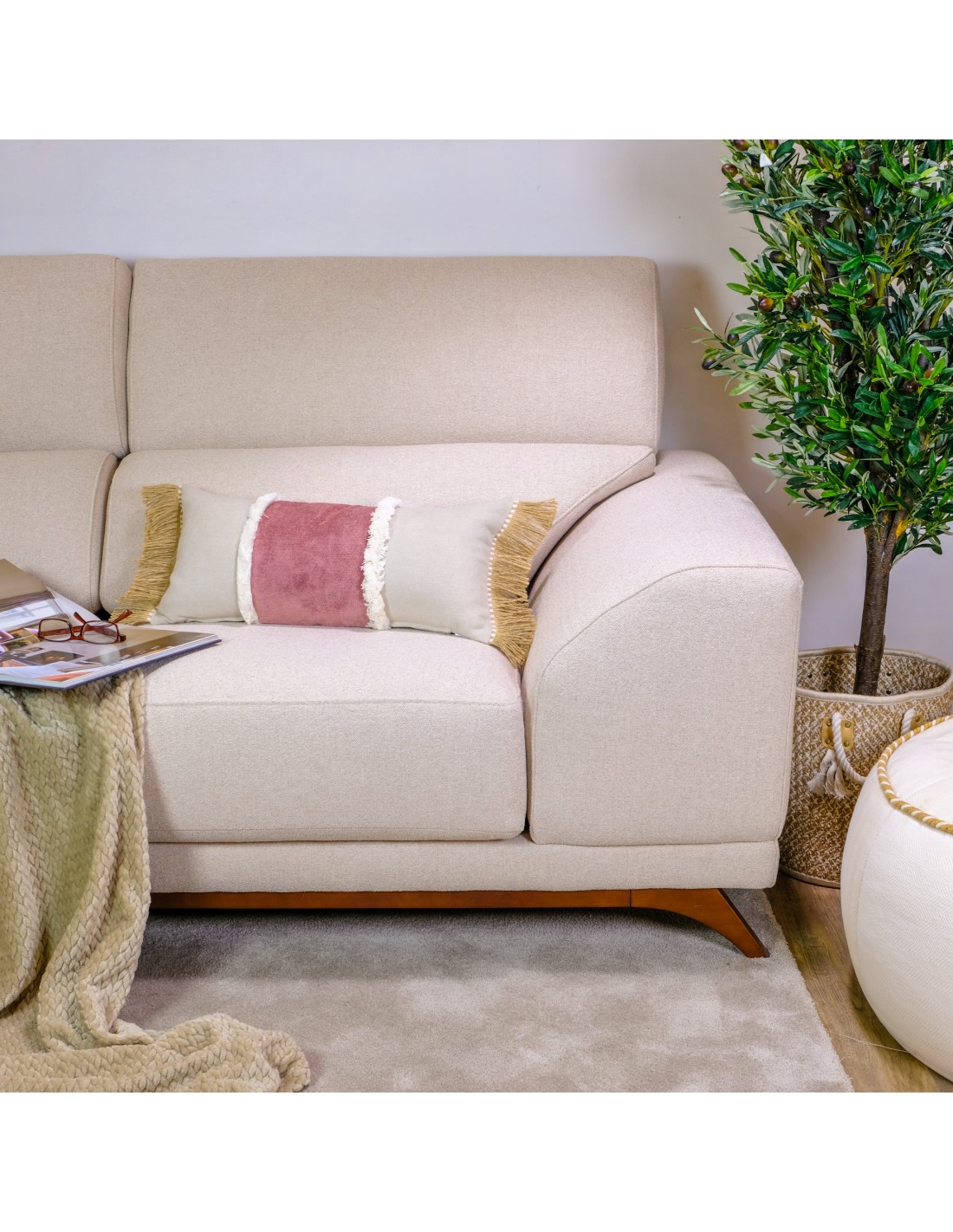 Cojín Relleno Premium efecto Pluma incluido, 60x30 tejido Chenilla color Arena con Banda Central Rosa Púrpura y doble Fleco Rafia y algodón color arena. Descubre el confort supremo con nuestros cojines Tapidecor, diseñados para crear un ambiente único y exclusivo en tu dormitorio o salón.