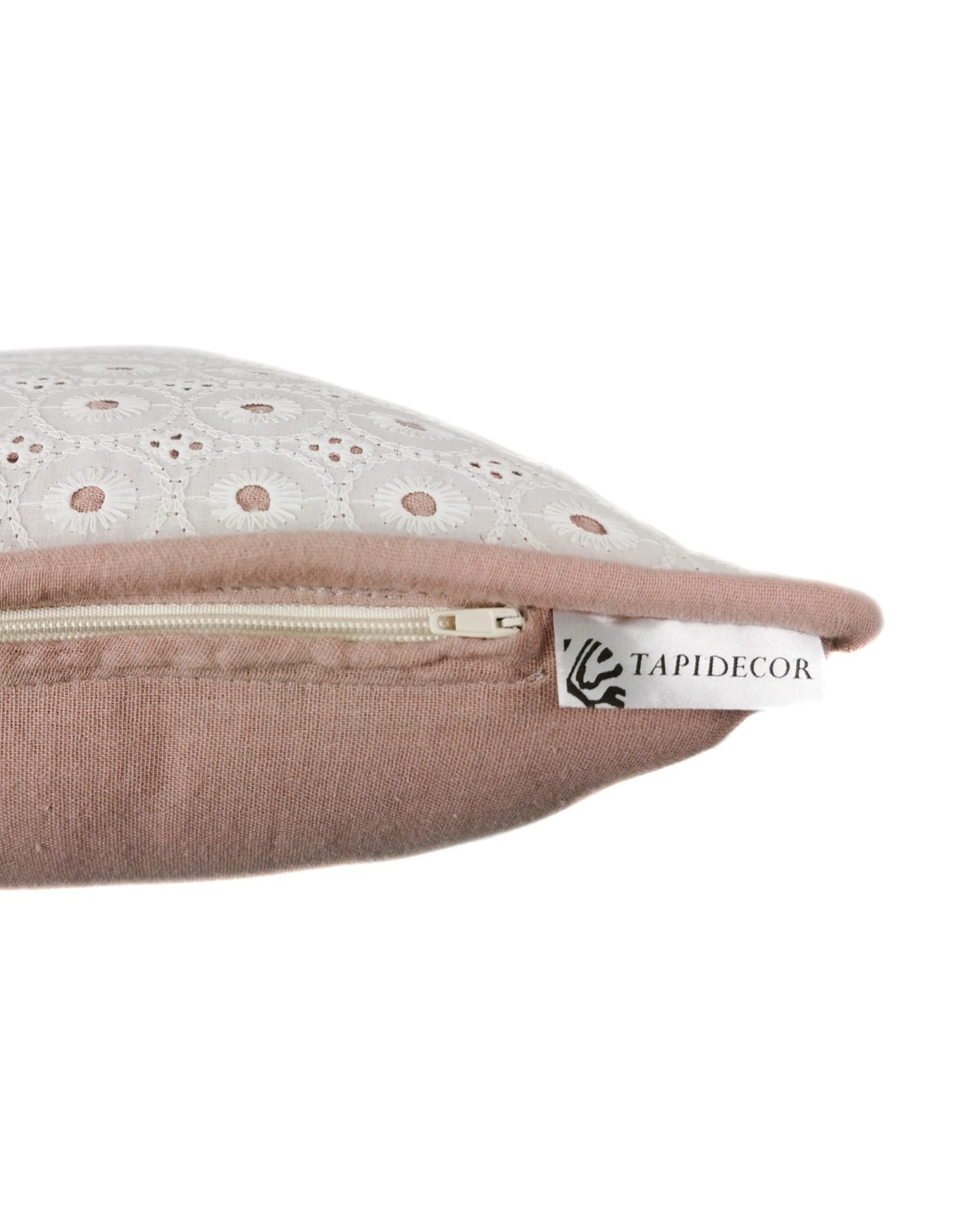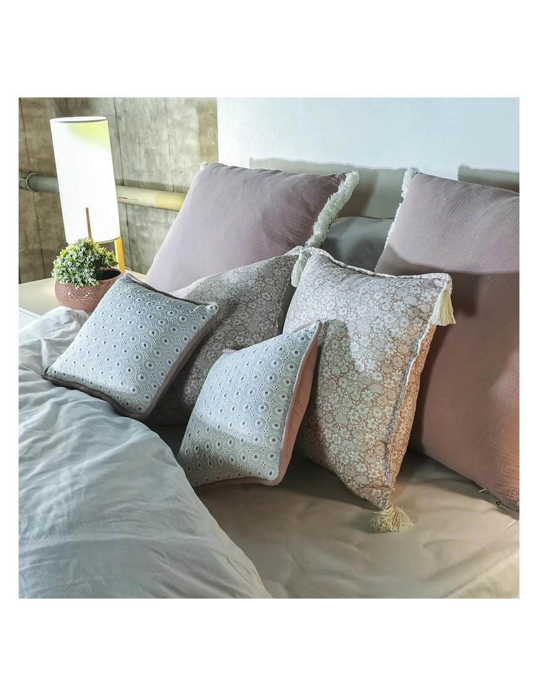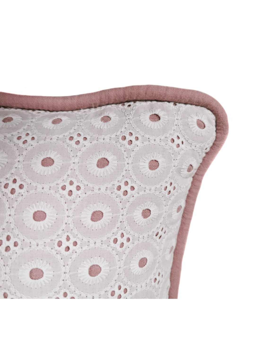 Cojín en rosa empolvado con detalle en voile blanco. Relleno premium incluido. Ideal para aportar suavidad y contraste.