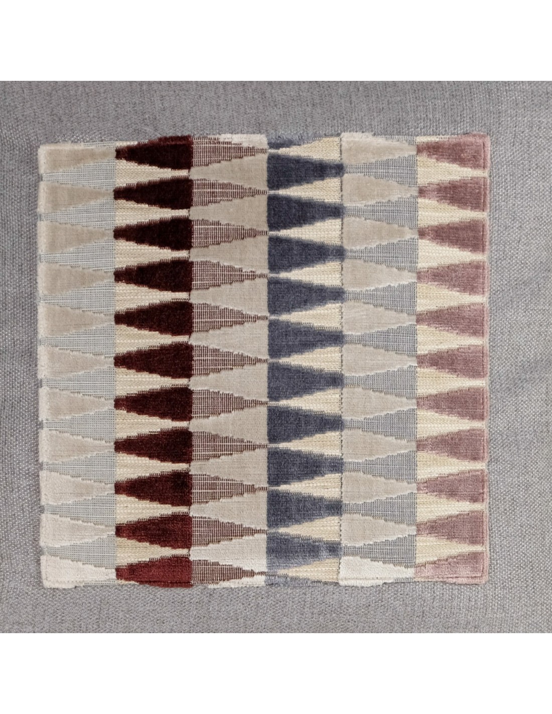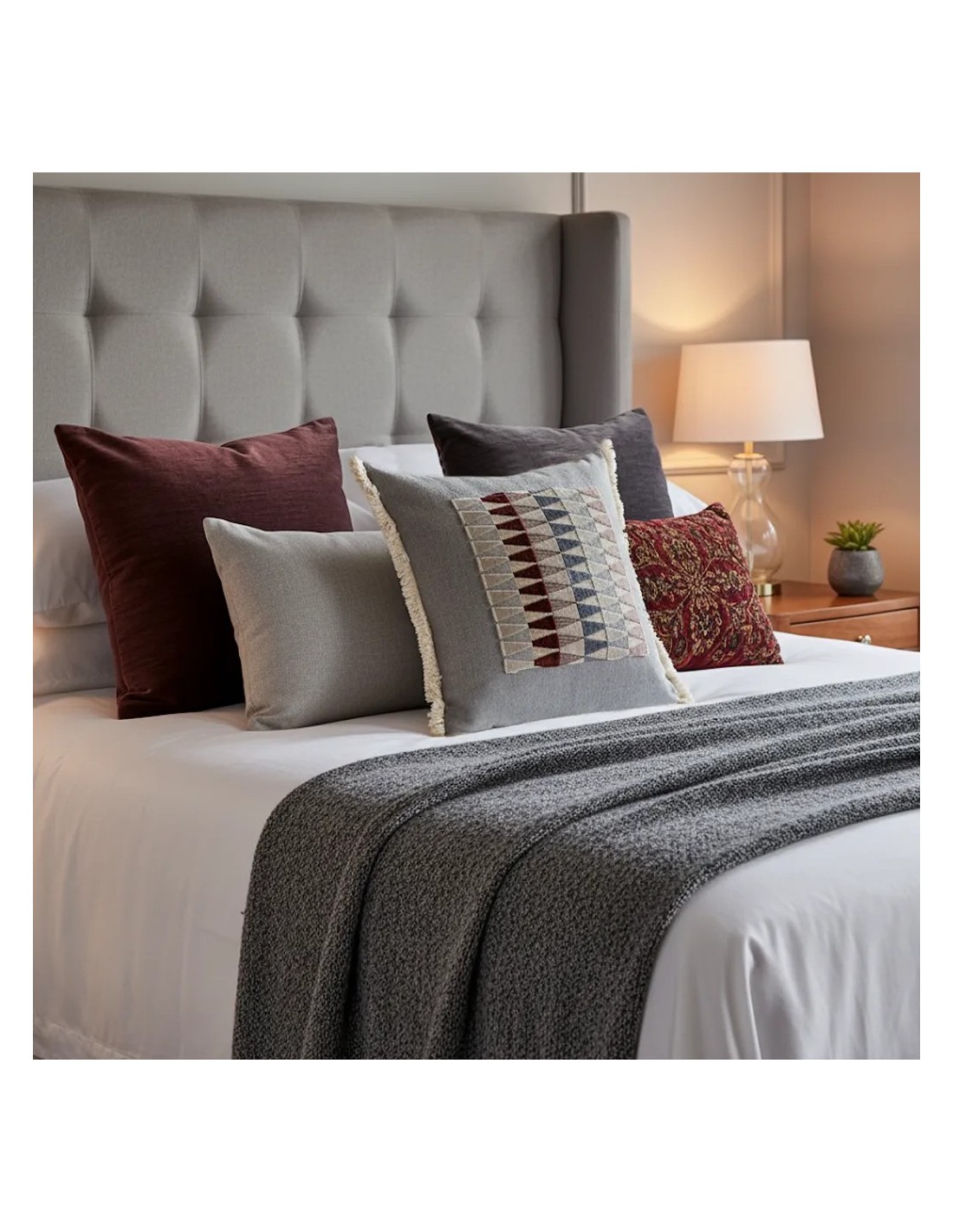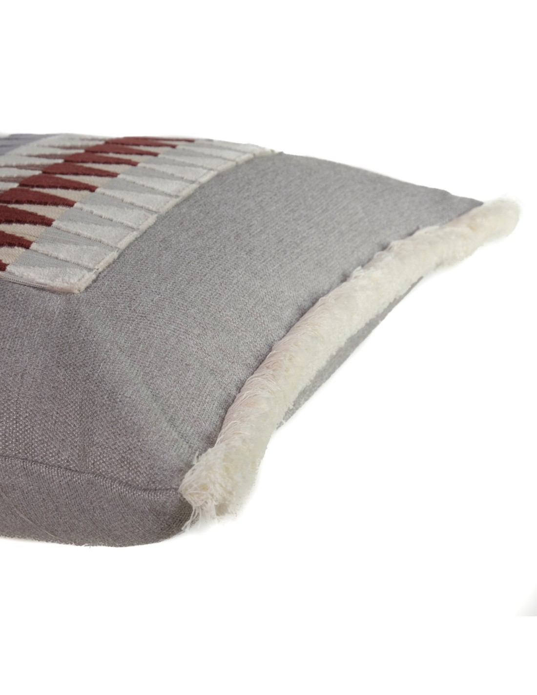Cojín en gris piedra con centro geométrico y fleco de algodón blanco. Relleno premium incluido. Aporta textura y equilibrio visual.