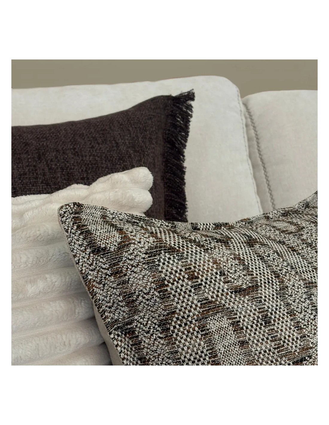 Cojín geométrico marrón chocolate. Exquisito diseño y suaves texturas añaden un toque de elegancia a cualquier espacio. El relleno premium con efecto pluma garantiza comodidad y estilo. Perfecto para realzar la belleza de tu hogar. ¡Una verdadera joya para tu decoración!