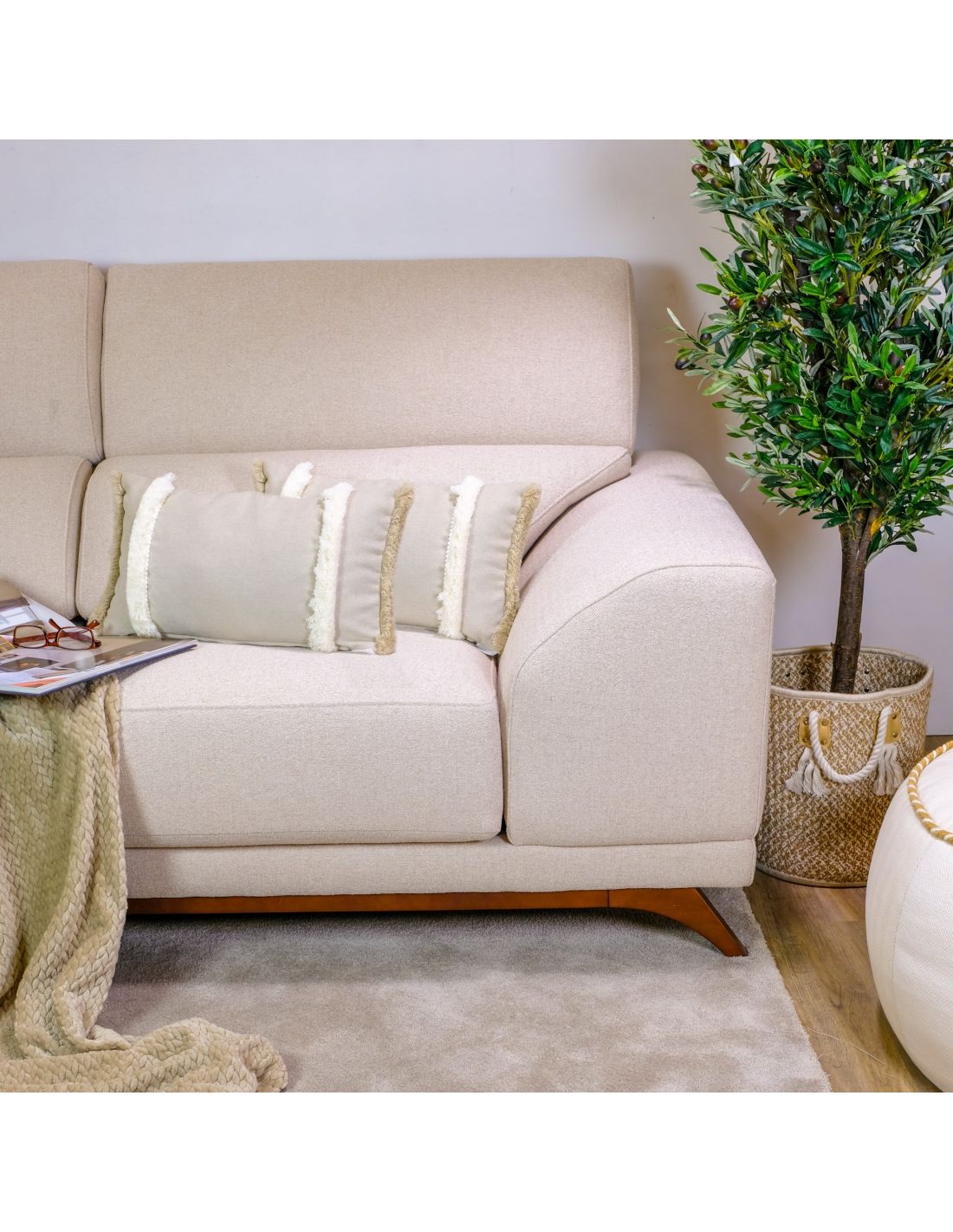 Cojín liso en tonos arena con doble fleco blanco. Relleno premium incluido. Aporta textura y equilibrio natural.
