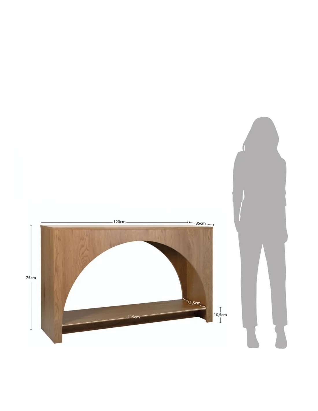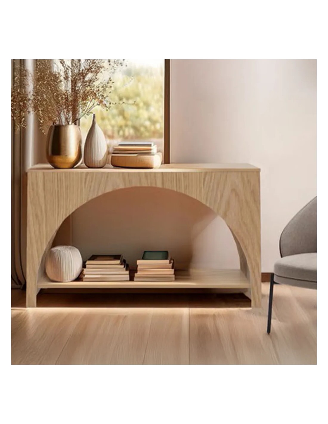 Consola de líneas arquitectónicas con arco integrado, realizada en madera natural. Una pieza equilibrada y elegante para entradas y salones contemporáneos.