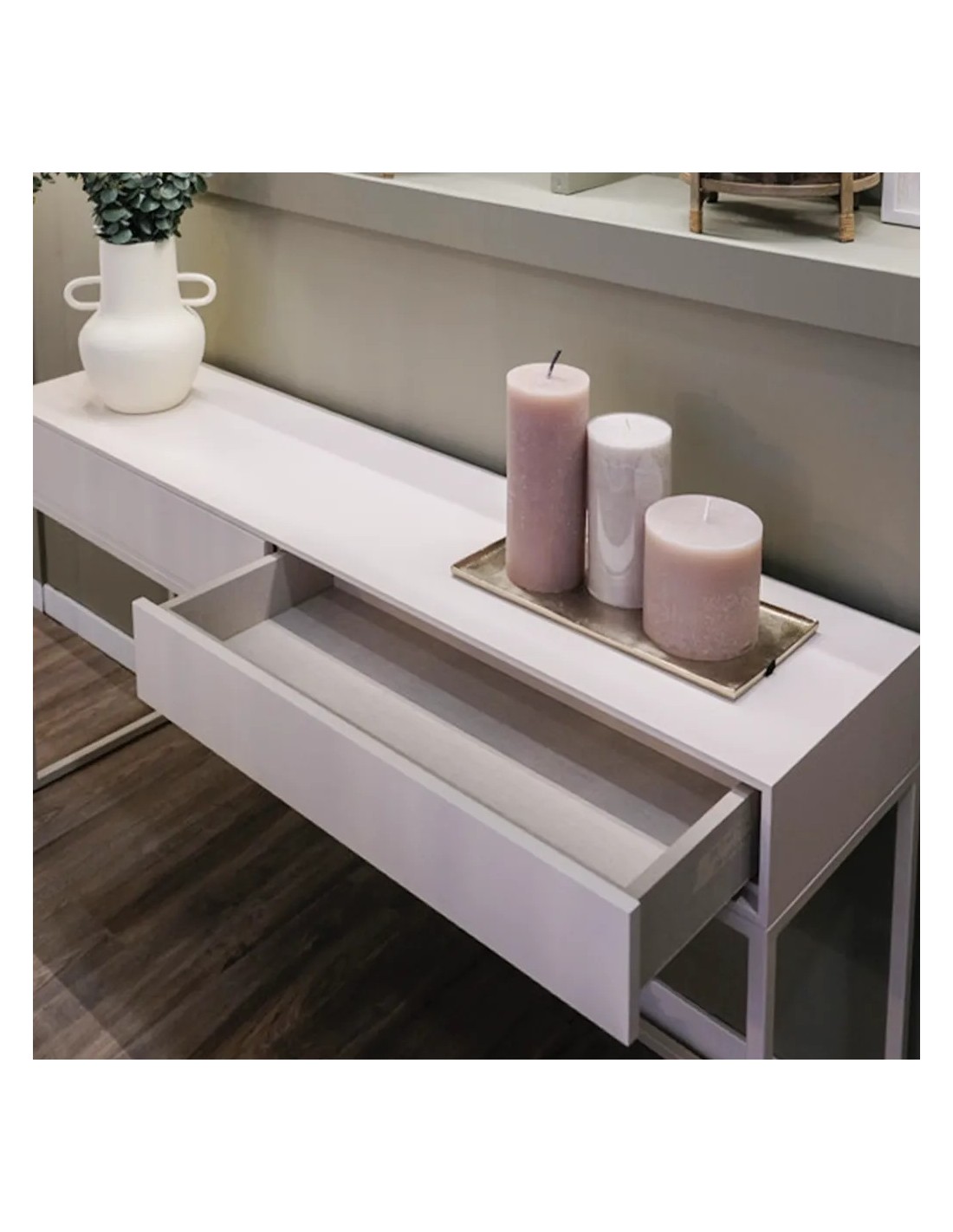 Consola de diseño limpio y proporciones equilibradas, acabada en laca beige mate y patas metálicas. Fabricada en DM lacado o chapa de madera natural, salvo las cubetas interiores de los cajones, realizadas en melamina textil. Todas las estructuras están ensambladas a inglete, lo que refuerza su estética minimalista. Los cajones incorporan sistema push de apertura, sin tiradores visibles.