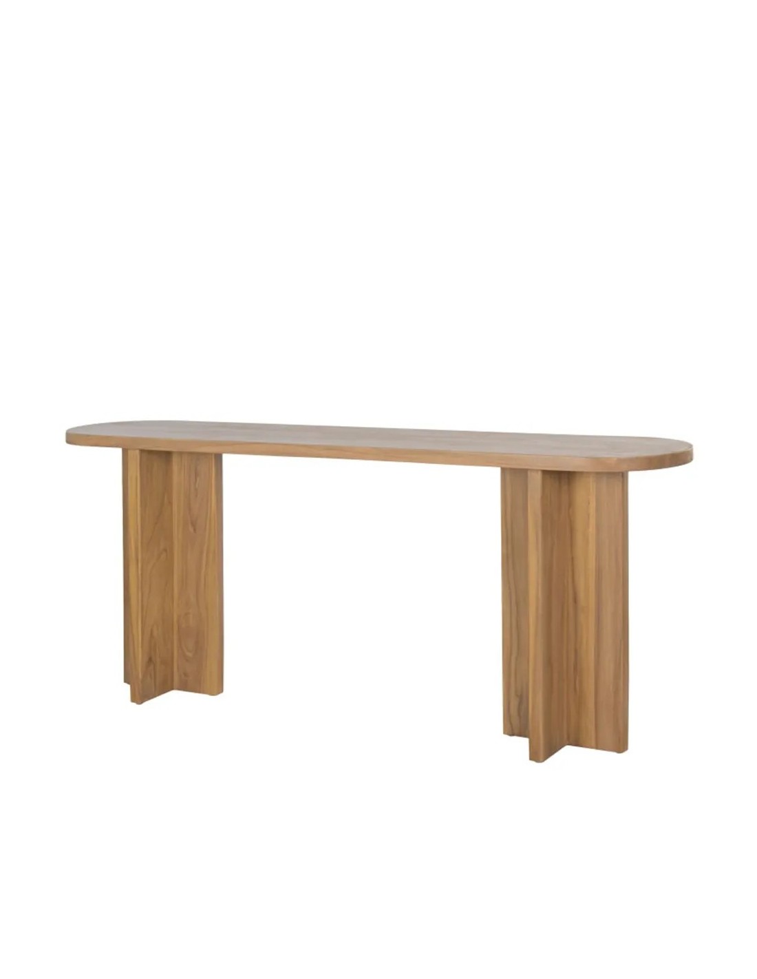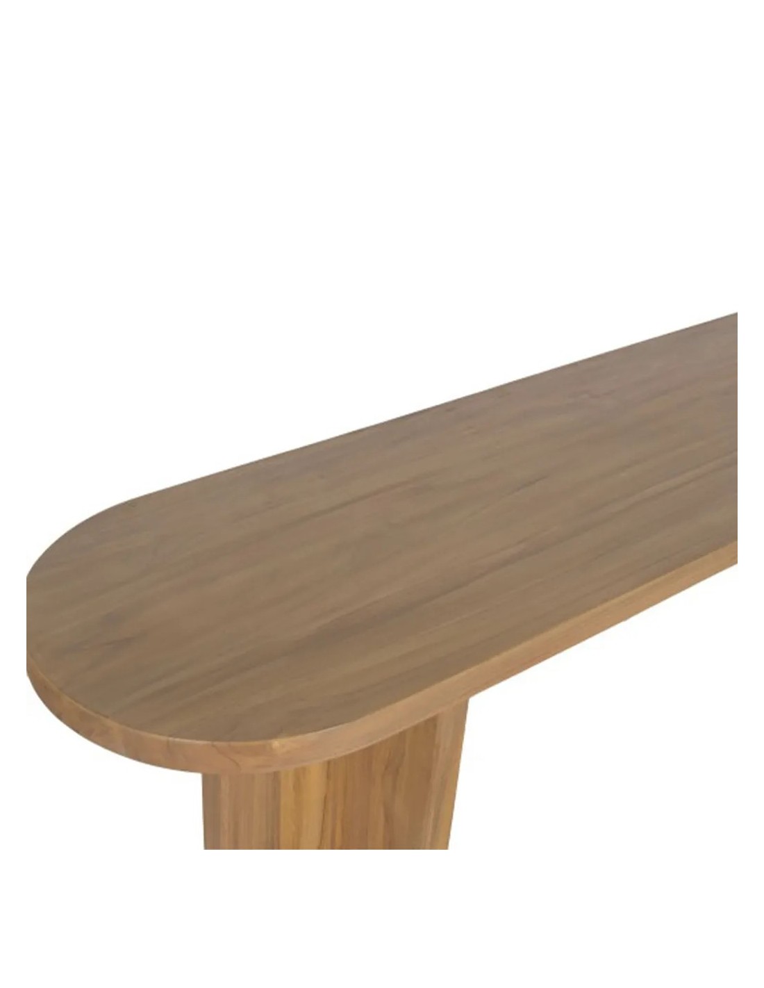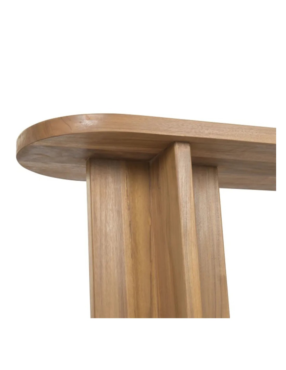 Consola fabricada en madera maciza de teca con acabado satinado mate y veta visible. Su tapa ovalada de esquinas redondeadas se apoya sobre una base doble en forma de cruz, que aporta solidez visual y carácter escultórico. Las proporciones alargadas y la textura sutil con ondulaciones naturales refuerzan su estética cálida y orgánica. El tono miel dorado con matices cálidos resalta la belleza natural de la teca sin oscurecerla.