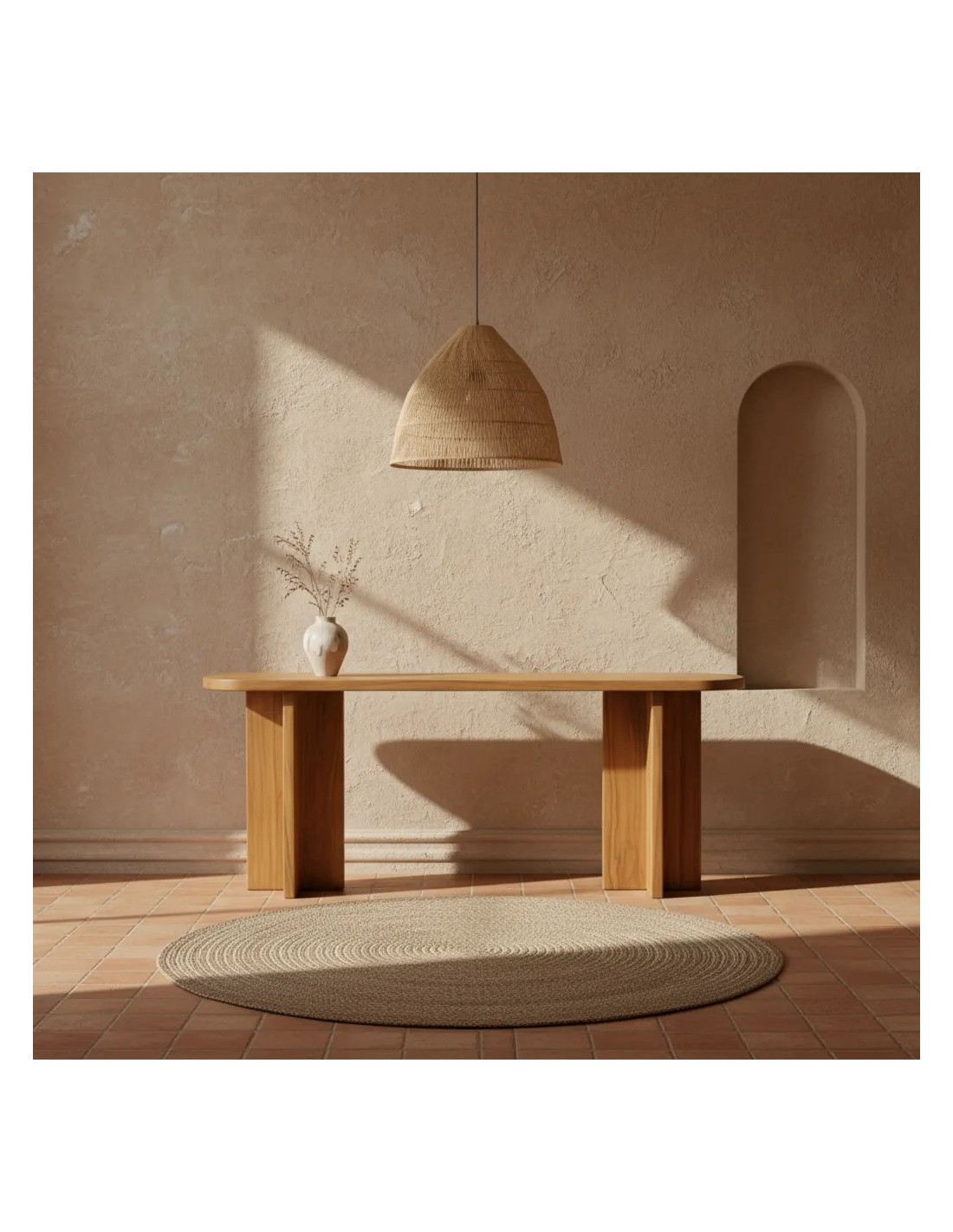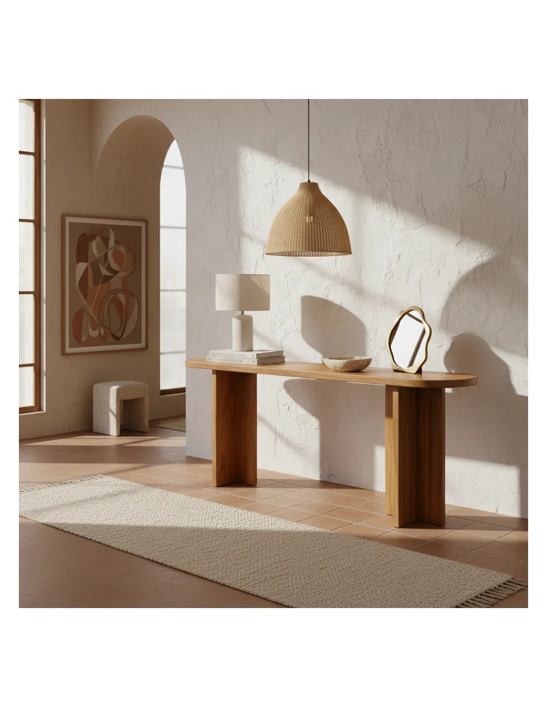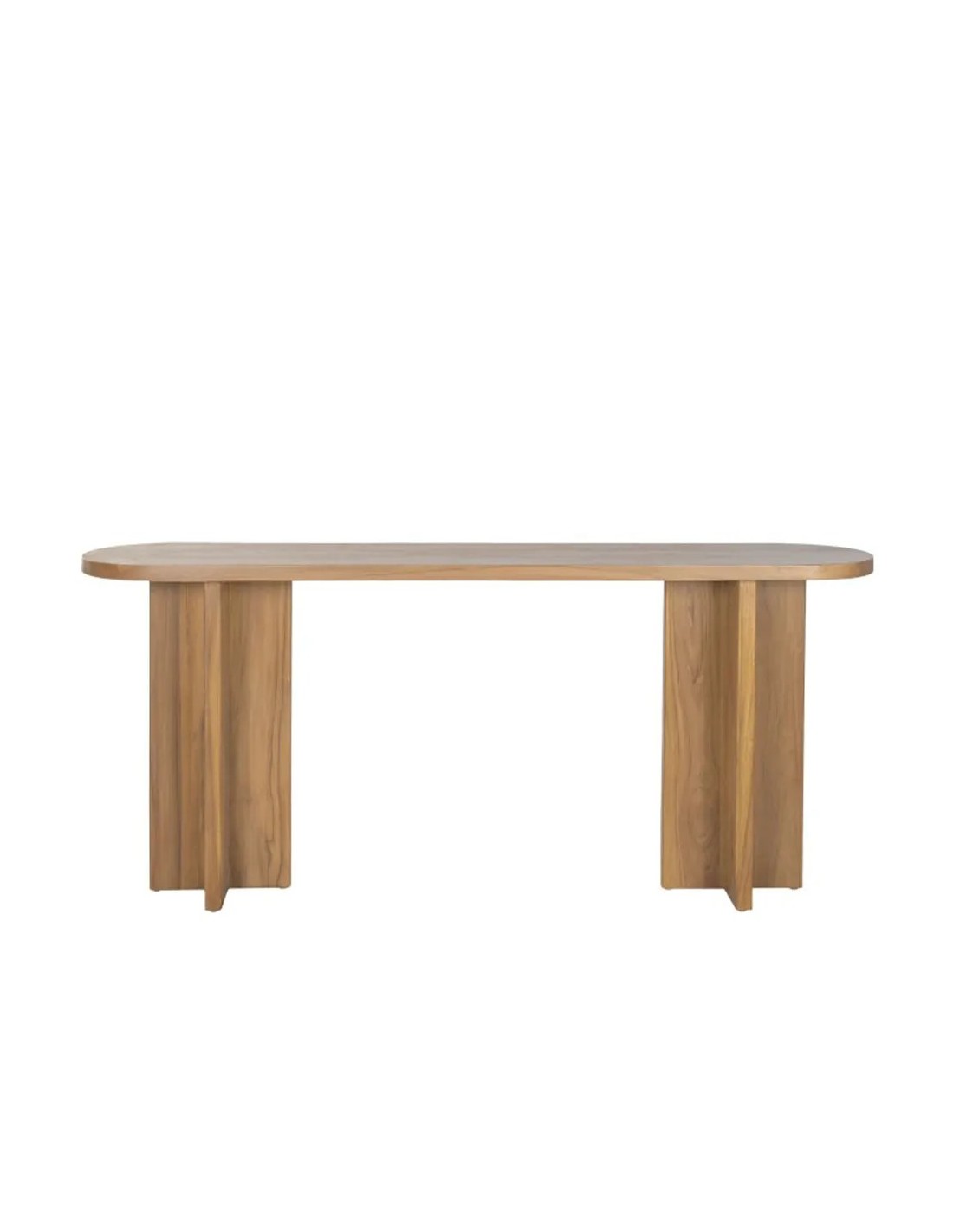 Consola fabricada en madera maciza de teca con acabado satinado mate y veta visible. Su tapa ovalada de esquinas redondeadas se apoya sobre una base doble en forma de cruz, que aporta solidez visual y carácter escultórico. Las proporciones alargadas y la textura sutil con ondulaciones naturales refuerzan su estética cálida y orgánica. El tono miel dorado con matices cálidos resalta la belleza natural de la teca sin oscurecerla.