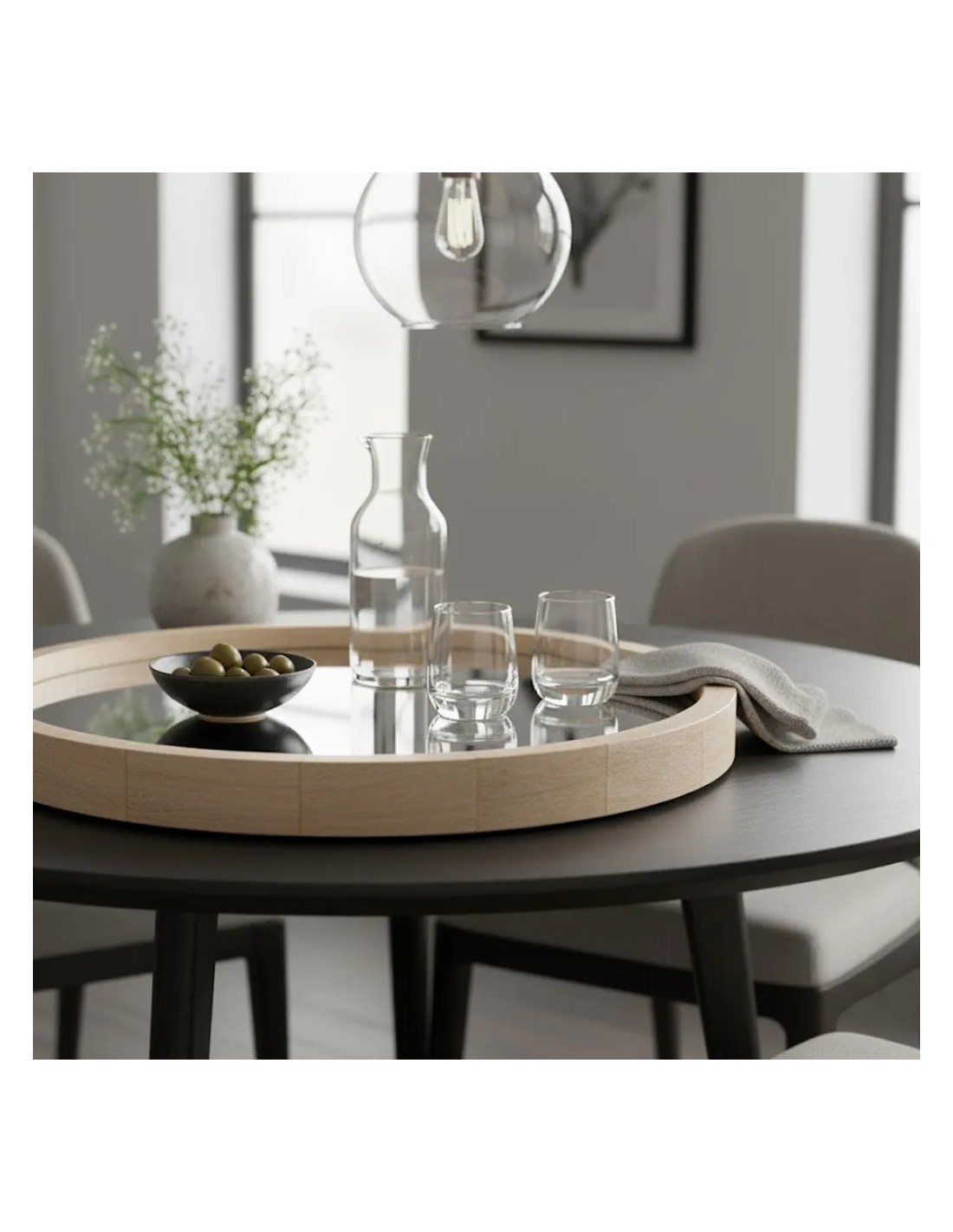 Esta bandeja-espejo redonda de madera (52 cm) combina funcionalidad y estética en una sola pieza. Su superficie reflectante amplía visualmente el espacio y aporta luz a cualquier ambiente, mientras que su base estable permite utilizarla como soporte decorativo para velas, jarrones o pequeños objetos. Ideal para crear composiciones con carácter, es una solución versátil que suma estilo sin renunciar a la utilidad.