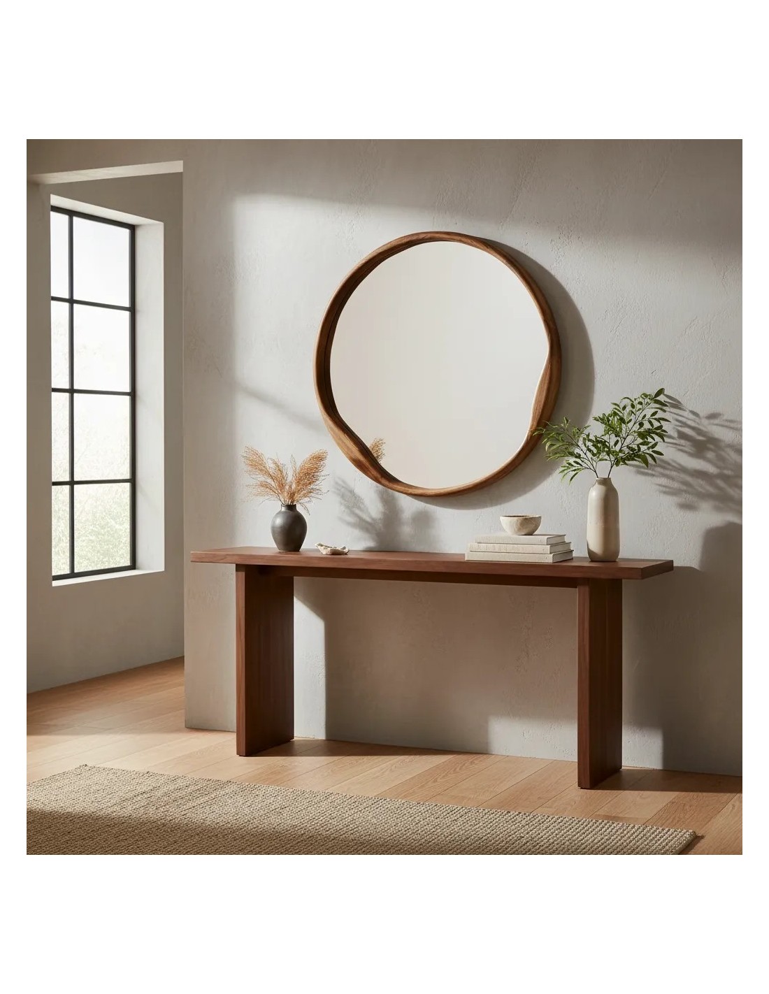 Espejo decorativo de 90 cm de diámetro, con marco redondo fabricado en madera maciza de Paulonia en acabado nogal natural. Su diseño orgánico, con ligeras variaciones en el grosor del marco, aporta calidez y carácter artesanal. Ideal para ampliar visualmente espacios y potenciar la luz natural en salones, recibidores o dormitorios. Su estilo versátil encaja tanto en ambientes modernos como en interiores de inspiración natural o escandinava.