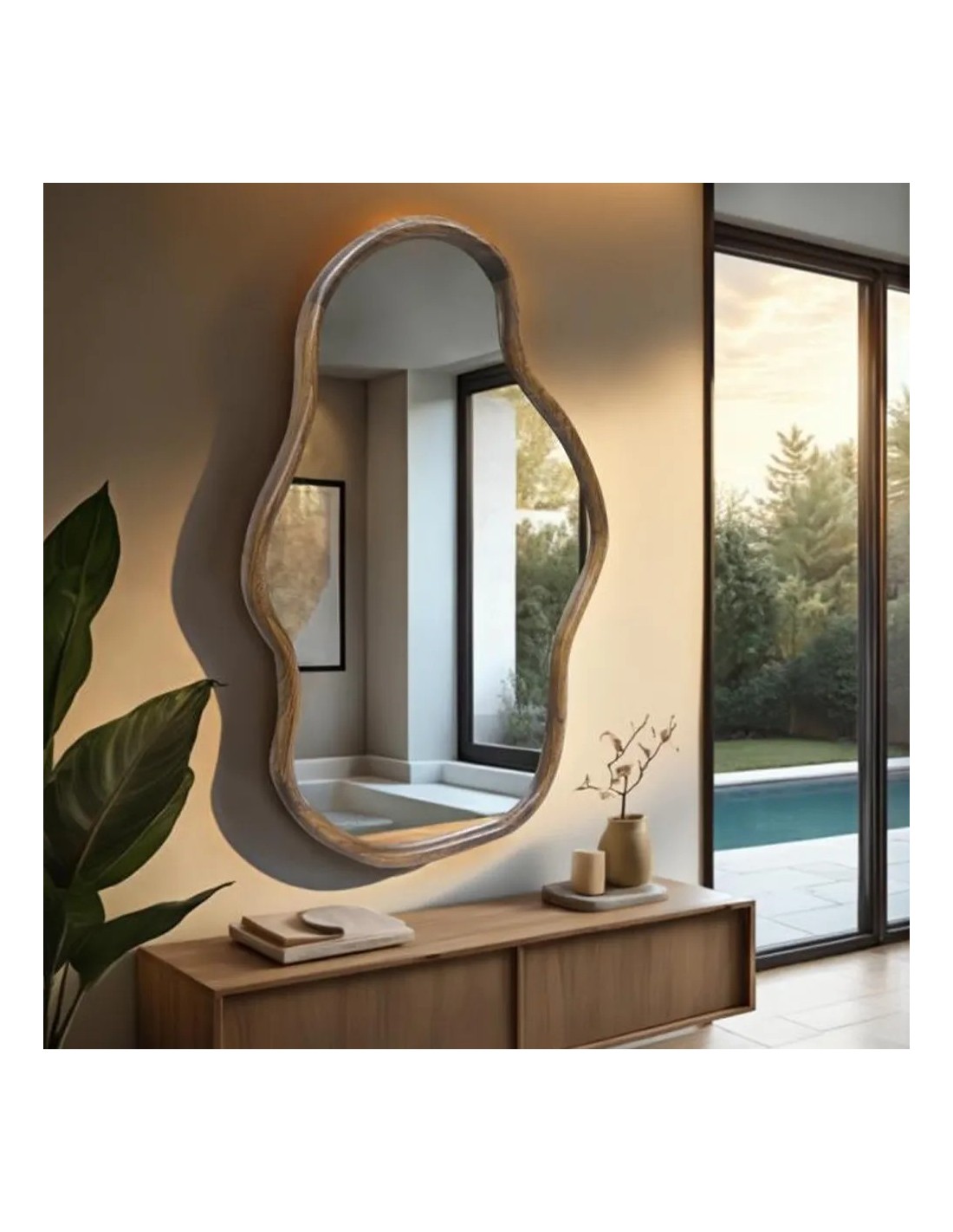 Espejo de pared con marco de madera en tono nogal, diseñado con contorno irregular que rompe con la simetría tradicional. Su estética orgánica y acabado cálido lo convierten en una pieza decorativa ideal para entradas, dormitorios o salones que buscan un toque artesanal y contemporáneo. Puede colocarse en posición vertical u horizontal, adaptándose a distintos estilos y espacios.