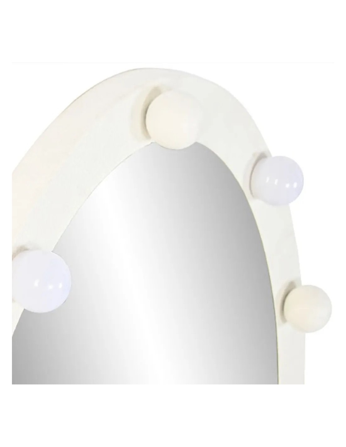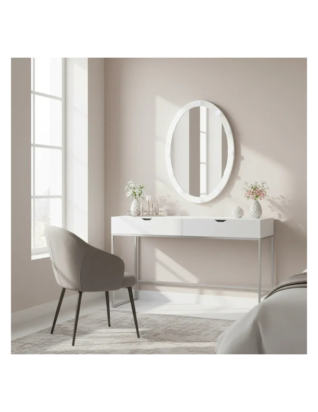 Este espejo ovalado blanco mide 63x91 cm y cuenta con bombillas LED integradas, ofreciendo una iluminación uniforme y de alta calidad, perfecta para maquillaje y arreglo personal. Su forma vertical y redondeada aporta suavidad y dinamismo a cualquier dormitorio. El marco blanco combina con múltiples paletas y estilos decorativos, mientras que las luces LED añaden un toque funcional y elegante. Ideal para tocadores juveniles o dormitorios principales, este espejo se convierte en un punto focal glamoroso que realza la decoración del espacio y proporciona un ambiente luminoso y sofisticado.
