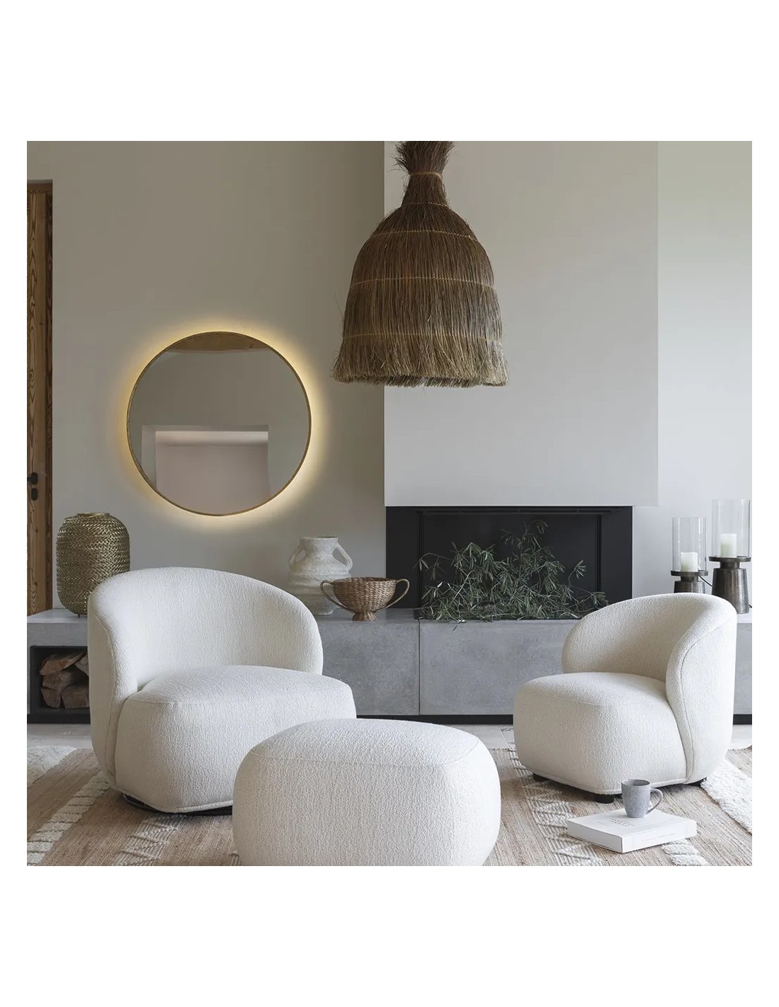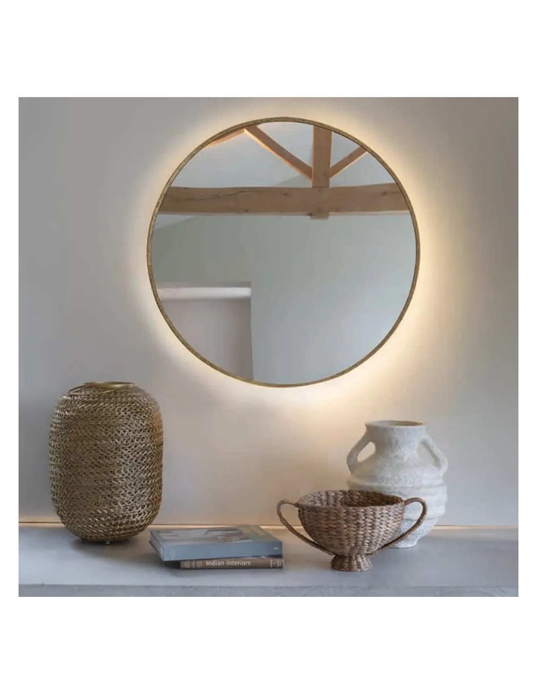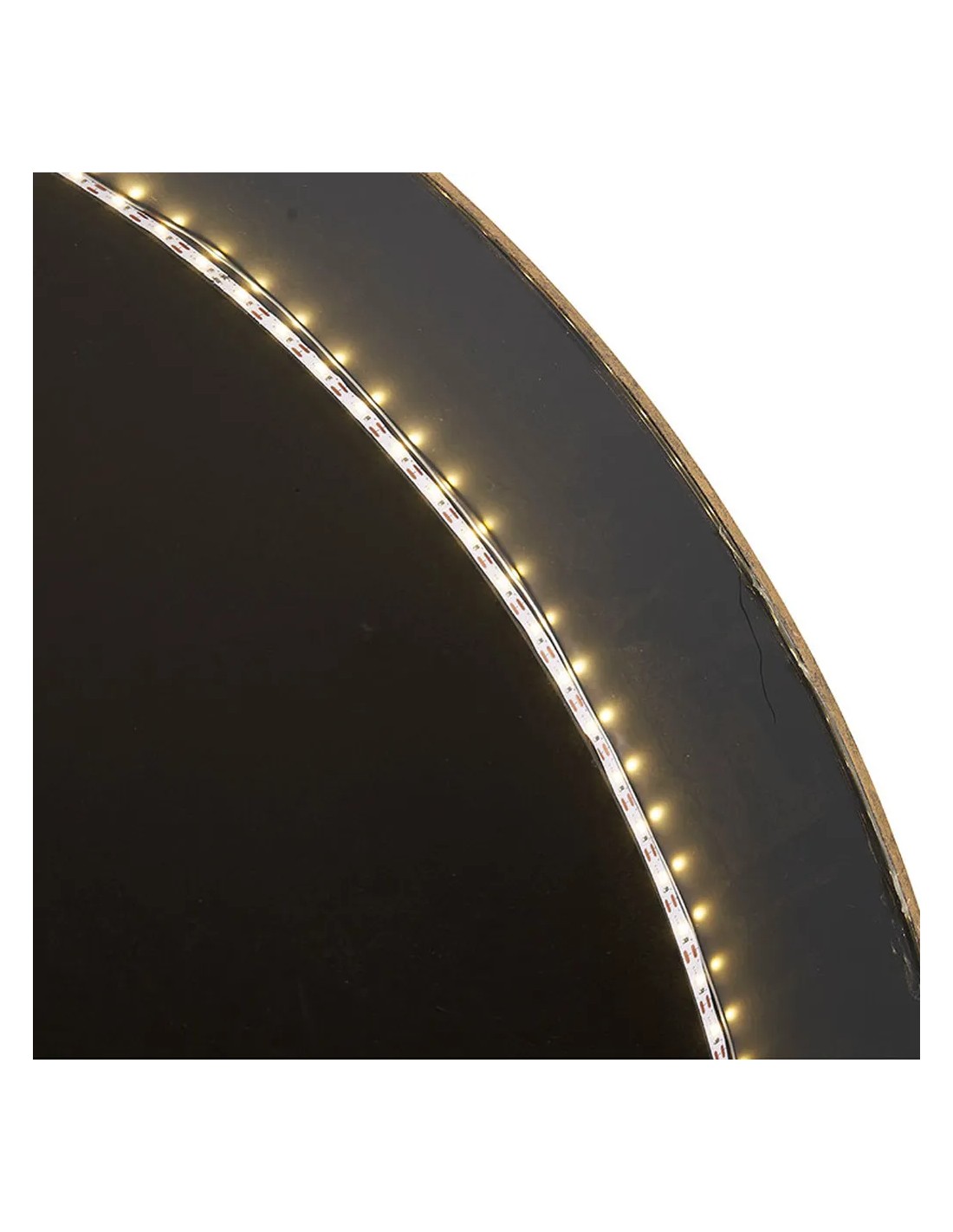 Espejo redondo con moldura dorada y retroiluminación LED integrada. Su diseño elegante aporta calidez y modernidad, mientras la luz envolvente realza la atmósfera. Con 90 cm de diámetro, es ideal para ampliar espacios y añadir un toque sofisticado en cualquier ambiente.