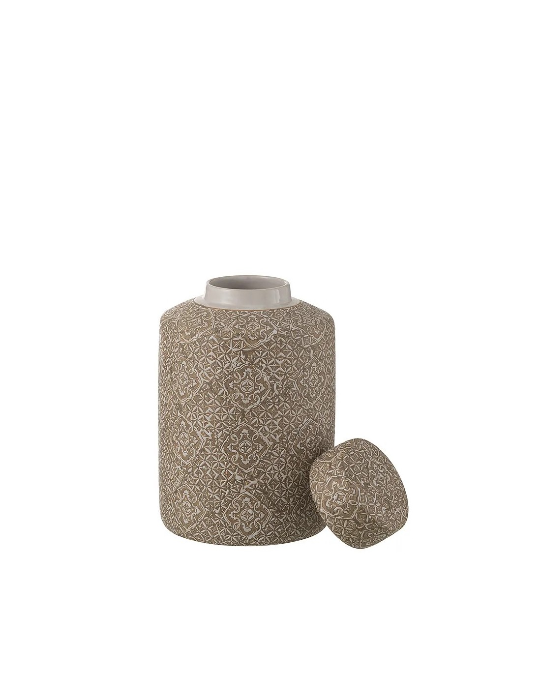 Tarro decorativo de porcelana en tonos beige y blanco, con delicados motivos geométricos que aportan estilo atemporal y sofisticación a cualquier estancia.